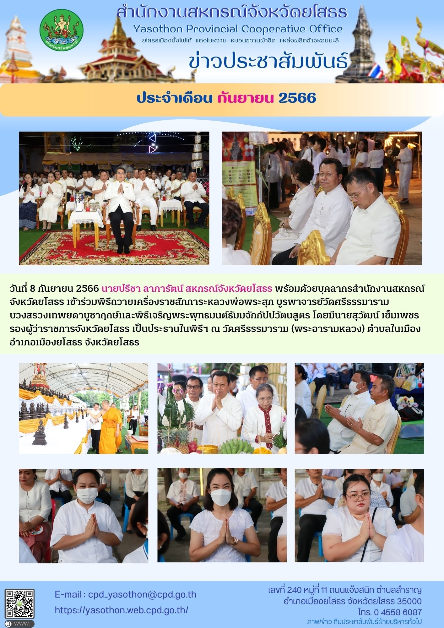 นายปรีชา ลาภารัตน์ สหกรณ์จังหวัดยโสธร พร้อมด้วยบุคลากรสำนักงานสหกรณ์จังหวัดยโสธร เข้าร่วมพฺิธีถวายเครื่องราชสักการะหลวงพ่อพระสุก บูรพาจารย์วัดศรีธรรมาราม ณ วัดศรีธรรมาราม (พระอารามหลวง)
