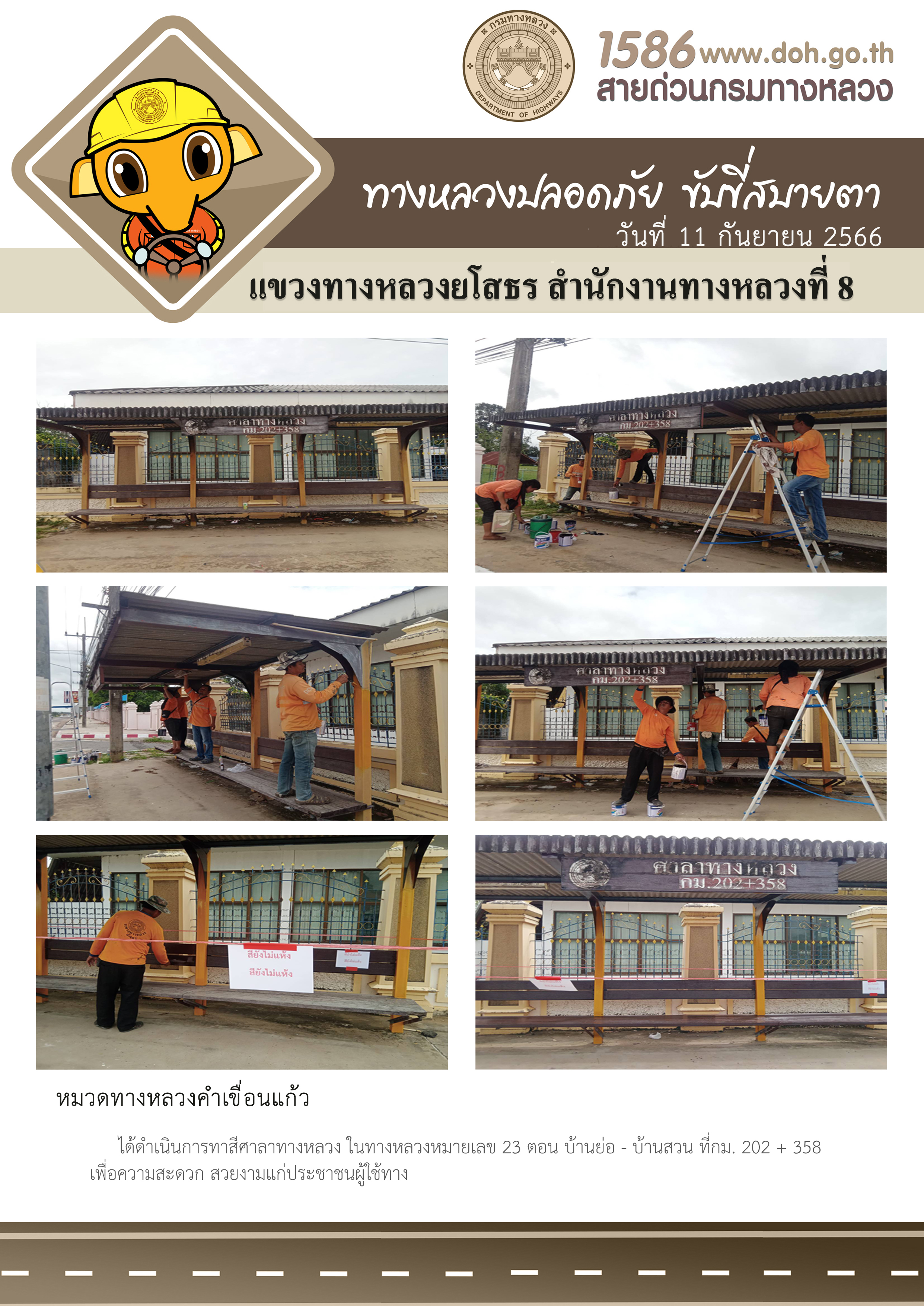 วันที่ 11 กันยายน 2566 หมวดทางหลวงคำเขื่อนแก้ว ได้ดำเนินการทาสีศาลาทางหลวง ในทางหลวงหมายเลข 23 ตอน บ้านย่อ - บ้านสวน ที่ กม.202 + 358 เพื่อความสะดวก สวยงามแก่ประชาชนผู้ใช้ทาง