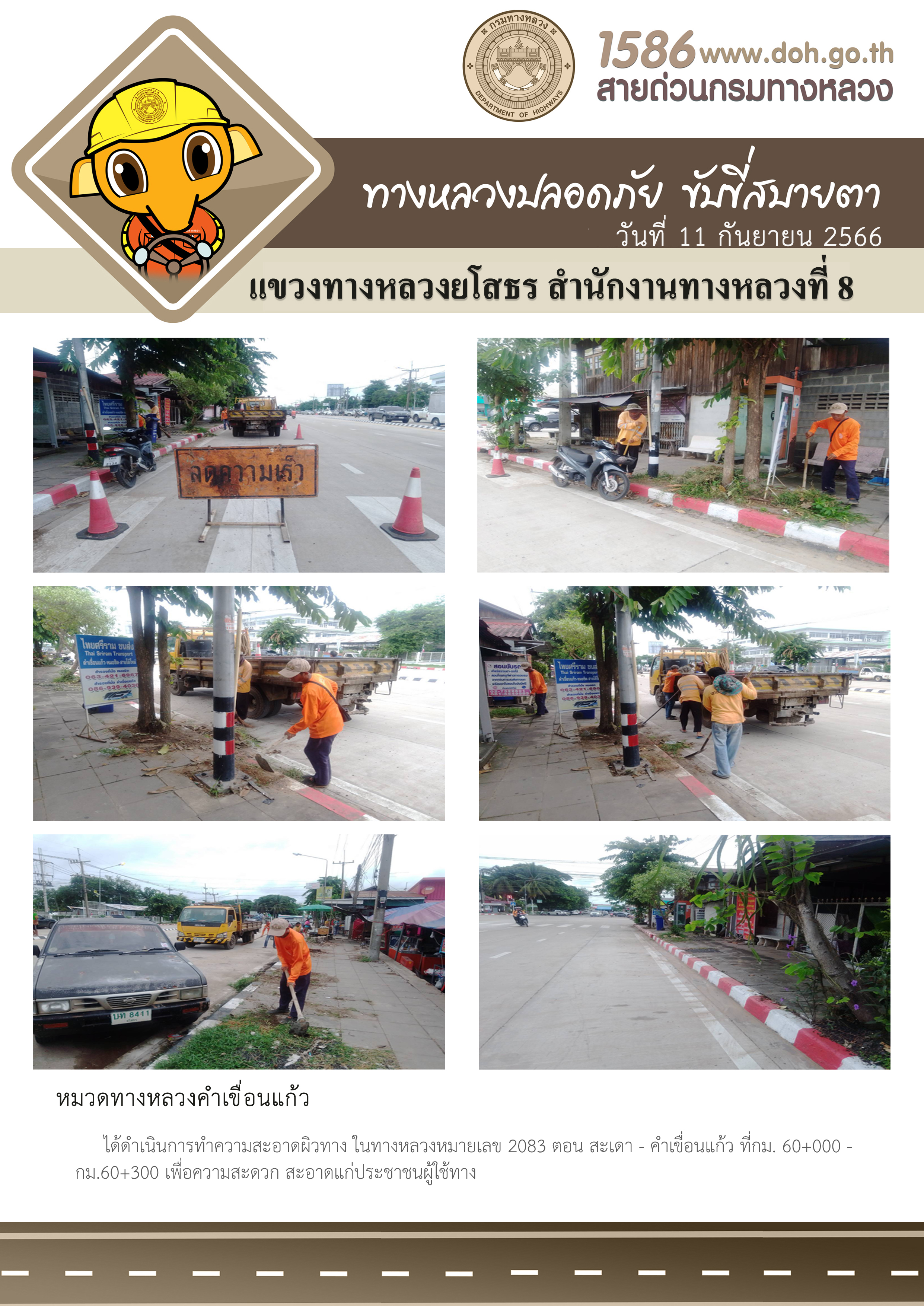 วันที่ 11 กันยายน 2566 หมวดทางหลวงคำเขื่อนแก้ว ได้ดำเนินการทำความสะอาดผิวทาง ในทางหลวงหมายเลข 2083 ตอน สะเดา - คำเขื่อนแก้ว ที่ กม.60+000 - กม.60+300 เพื่อความสะดวก สะอาดแก่ประชาชนผู้ใช้ทาง