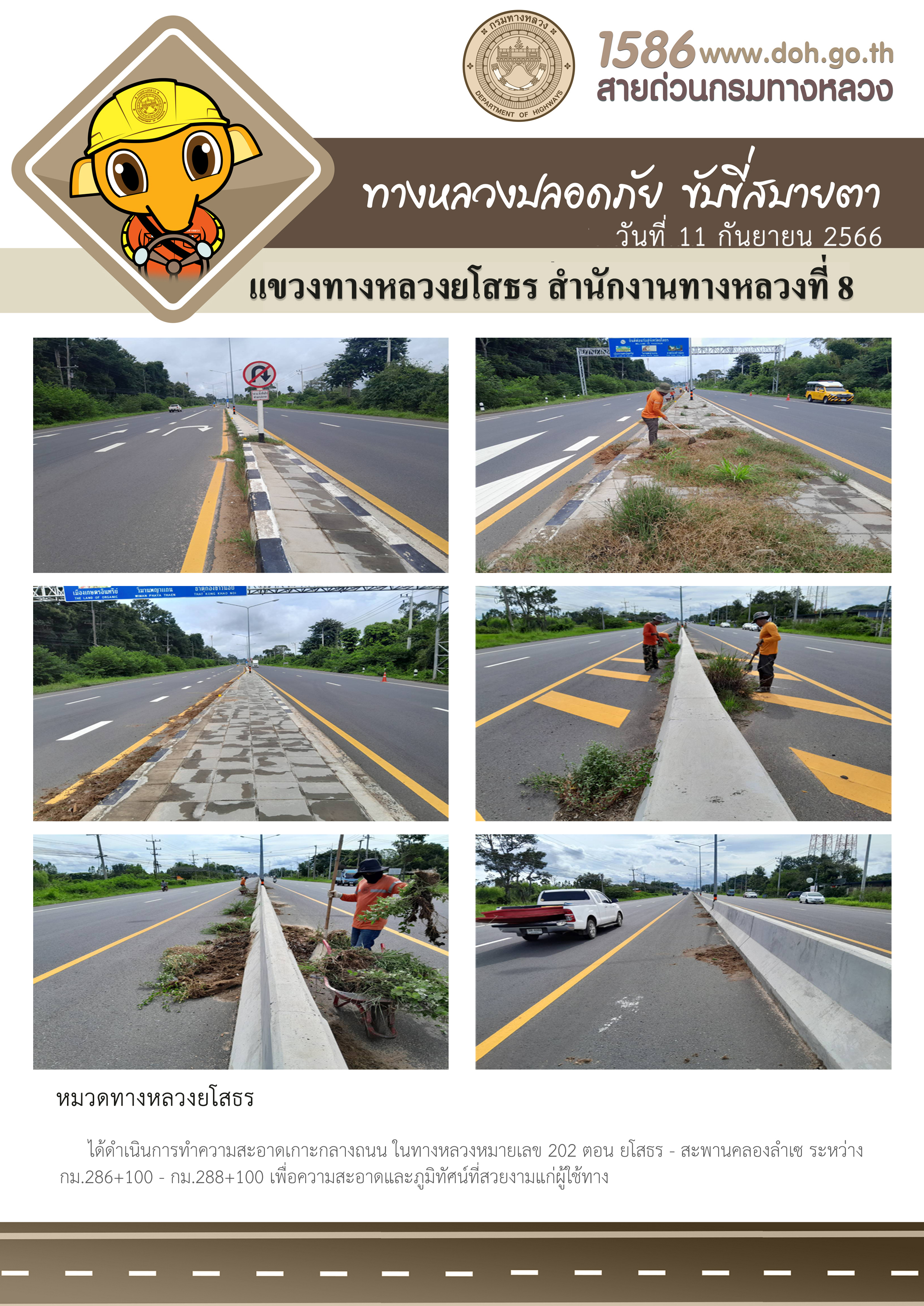 วันที่ 11 กันยายน 2566 หมวดทางหลวงยโสธร ได้ดำเนินการทำความสะอาดเกาะกลางถนน ในทางหลวงหมายเลข 202 ตอน ยโสธร - สะพานคลองลำเซ ระหว่าง กม.286+100 - กม.288+100 เพื่อความสะอาดและภูมิทัศน์ที่สวยงามแก่ผู้ใช้ทาง