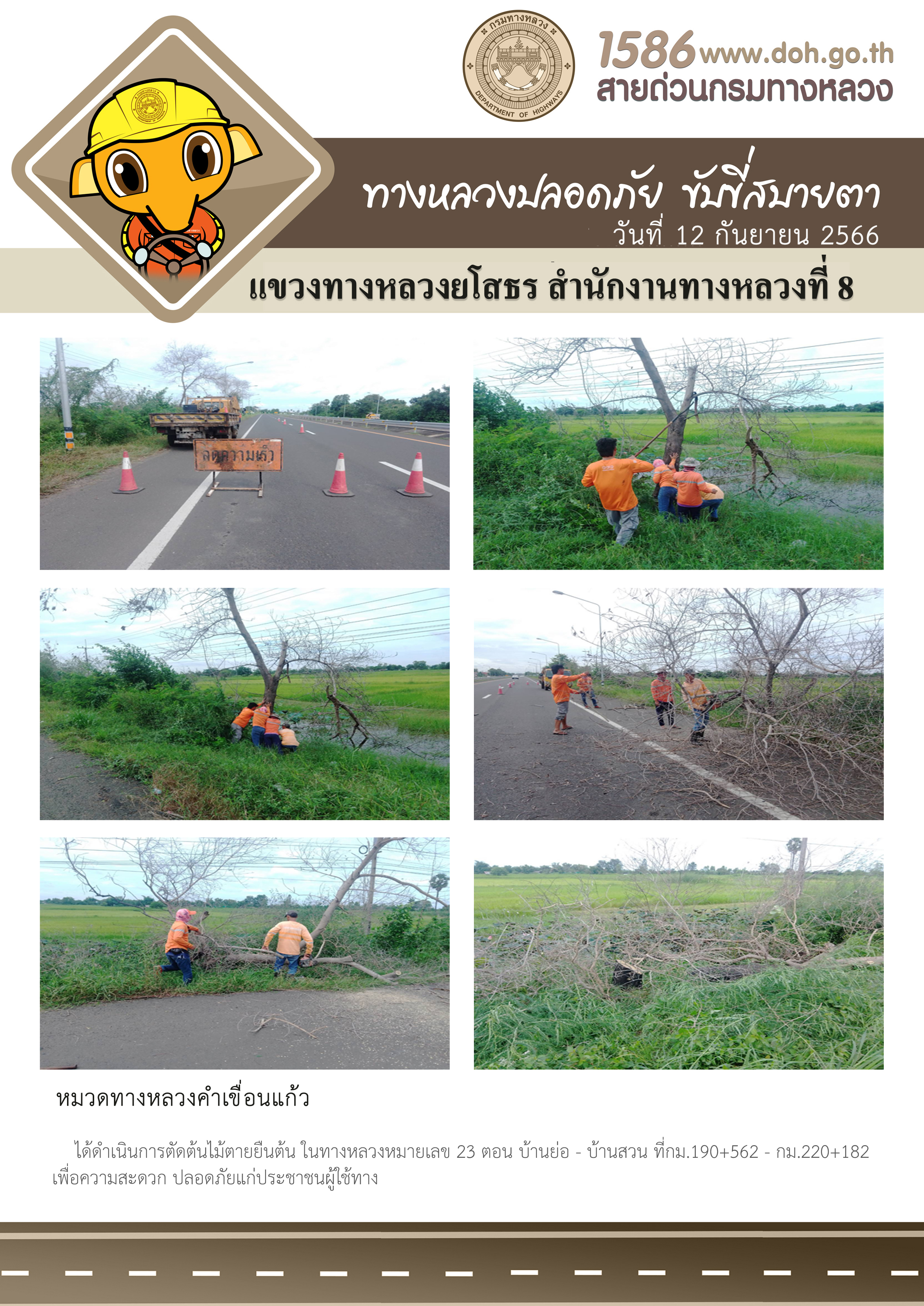 วันที่ 12 กันยายน 2566 หมวดทางหลวงคำเขื่อนแก้ว ได้ดำเนินการตัดต้นไม้ตายยืนต้น ในทางหลวงหมายเลข 23 ตอน บ้านย่อ - บ้านสวน ที่ กม.190+562 - กม.220+182 เพื่อความสะดวก ปลอดภัยแก่ประชาชนผู้ใช้ทาง
