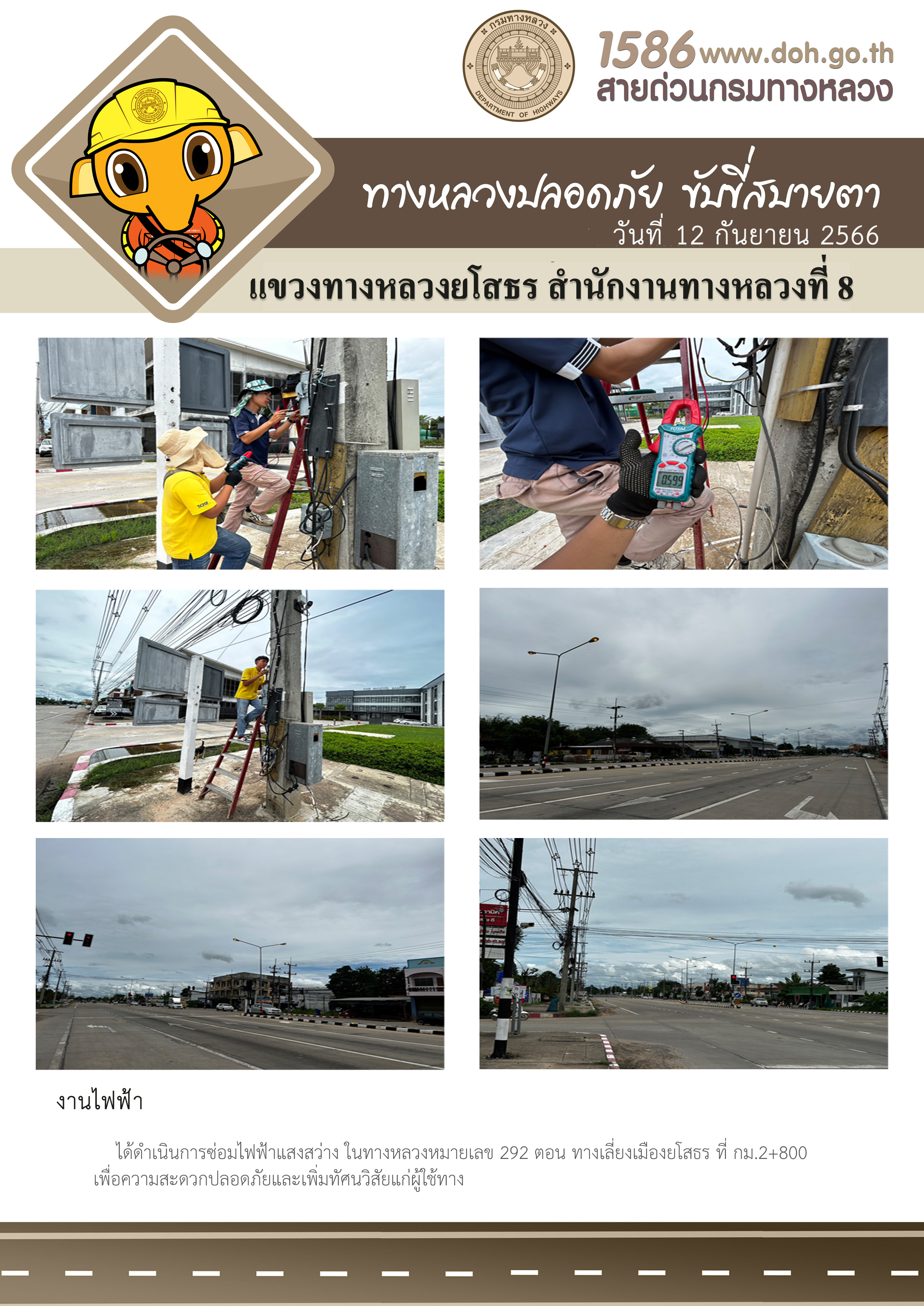 วันที่ 12 กันยายน 2566 งานไฟฟ้า ได้ดำเนินการซ่อมไฟฟ้าแสงสว่าง ในทางหลวงหมายเลข 292 ตอน ทางเลี่ยงเมืองยโสธร ที่ กม.2+800 เพื่อความสะดวกปลอดภัยและเพิ่มทัศนวิสัยแก่ผู้ใช้ทาง