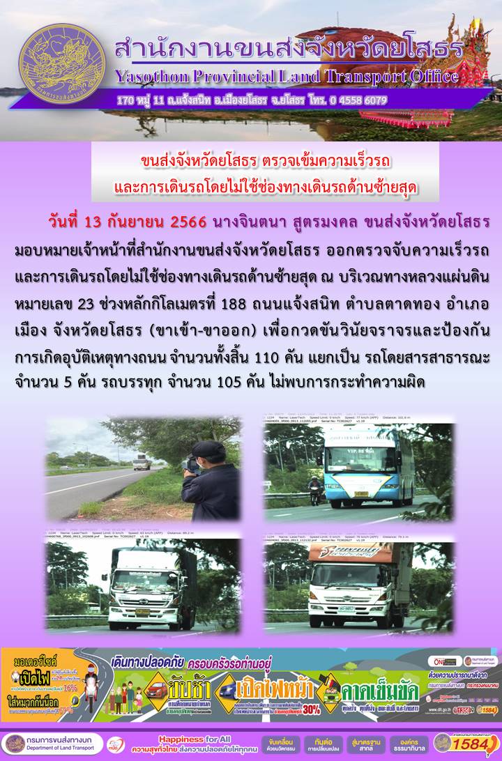 วันที่ 13 กันยายน 2566 เจ้าหน้าที่สำนักงานขนส่งจังหวัดยโสธร ออกตั้งจุดตรวจจับความเร็ว