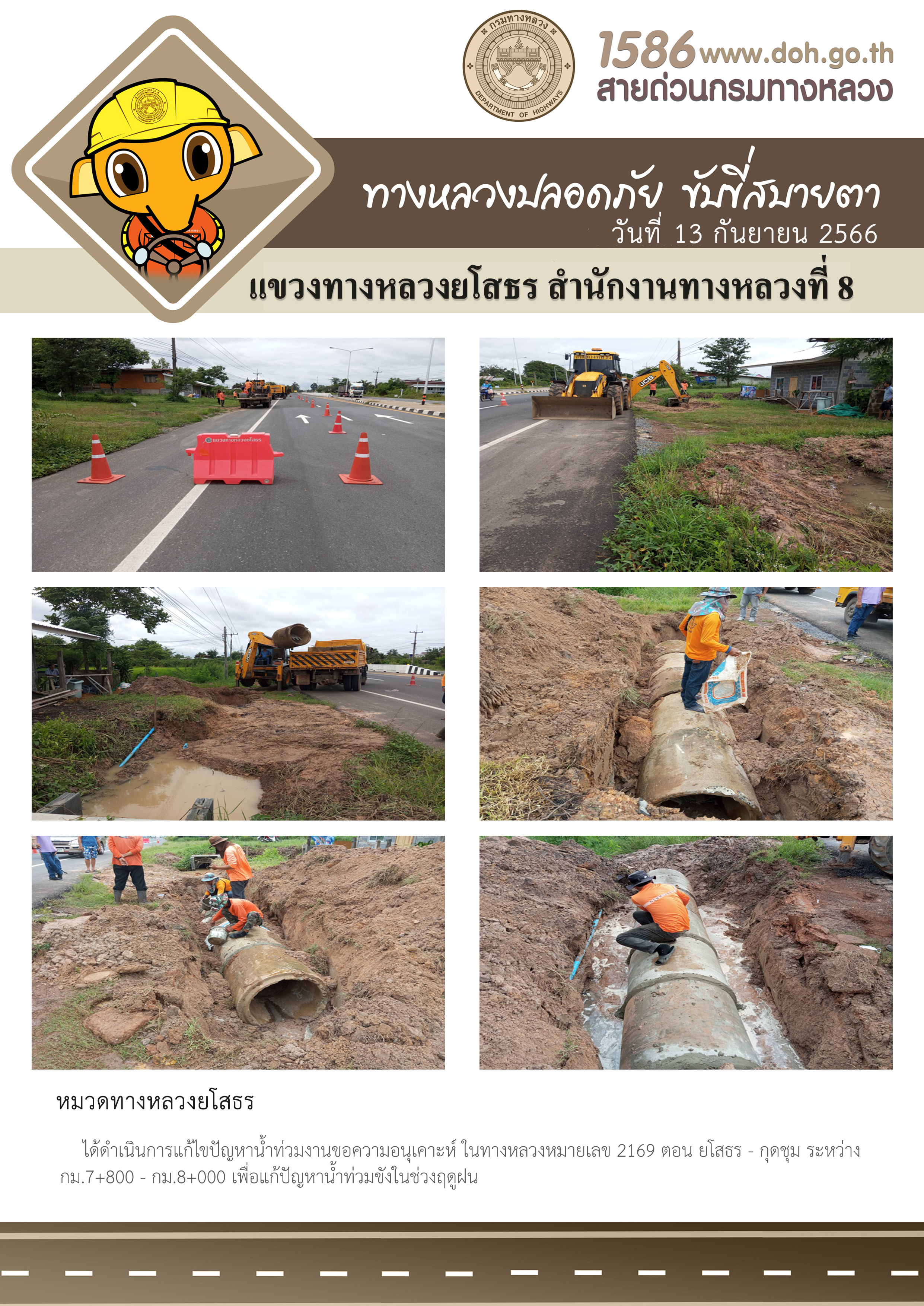 วันที่ 13 กันยายน 2566 หมวดทางหลวงยโสธร ได้ดำเนินการแก้ไขปัญหาน้ำท่วม ในทางหลวงหมายเลข 2169 ตอน ยโสธร - กุดชุม ระหว่าง กม.7+800 - กม.8+000 เพื่อแก้ปัญหาน้ำท่วมขังในช่วงฤดูฝน