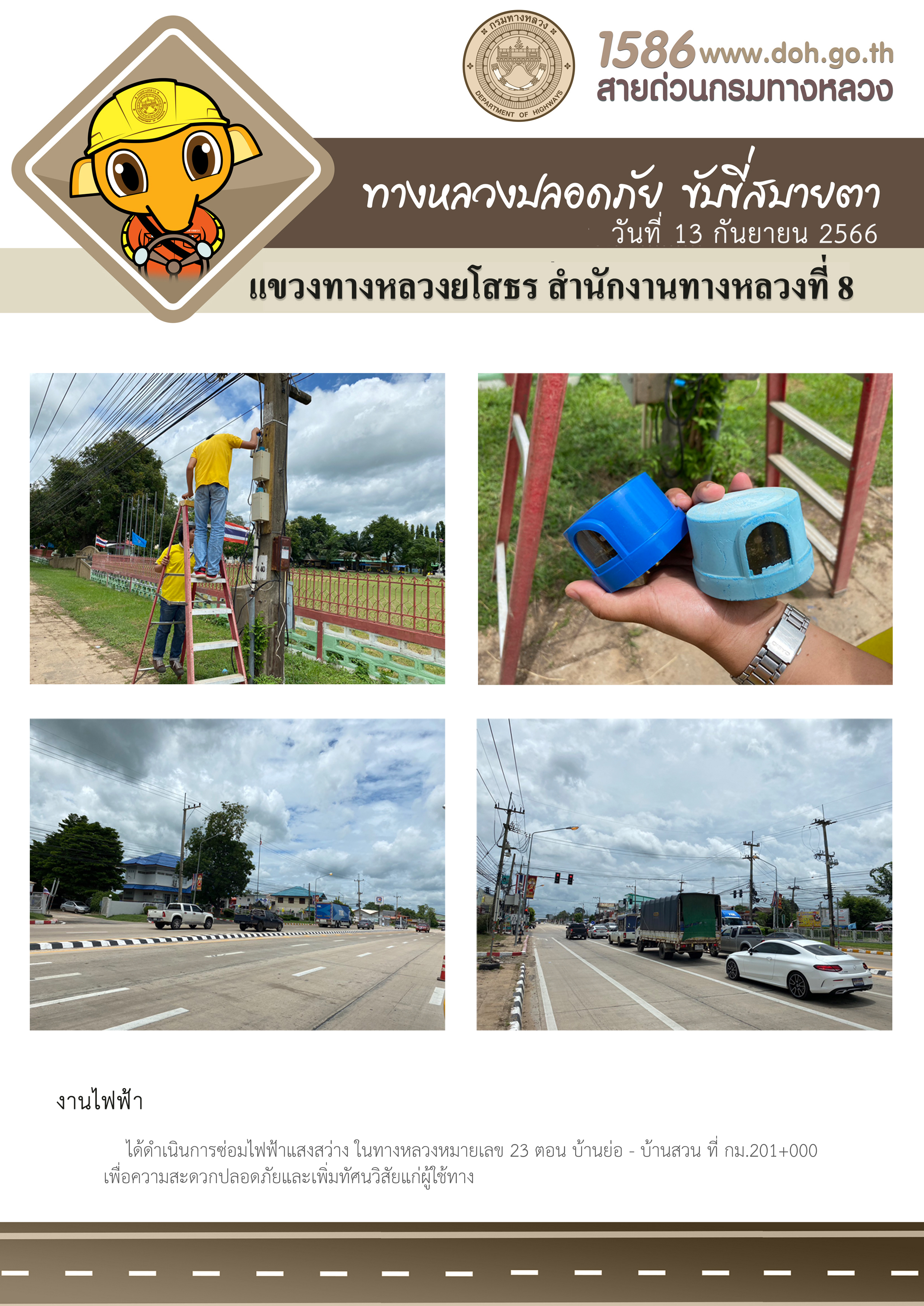 วันที่ 13 กันยายน 2566 งานไฟฟ้า ได้ดำเนินการซ่อมไฟฟ้าแสงสว่าง ในทางหลวงหมายเลข 23 ตอน บ้านย่อ - บ้านสวน ที่ กม.201+000 เพื่อความสะดวกปลอดภัยและเพิ่มทัศนวิสัยแก่ผู้ใช้ทาง