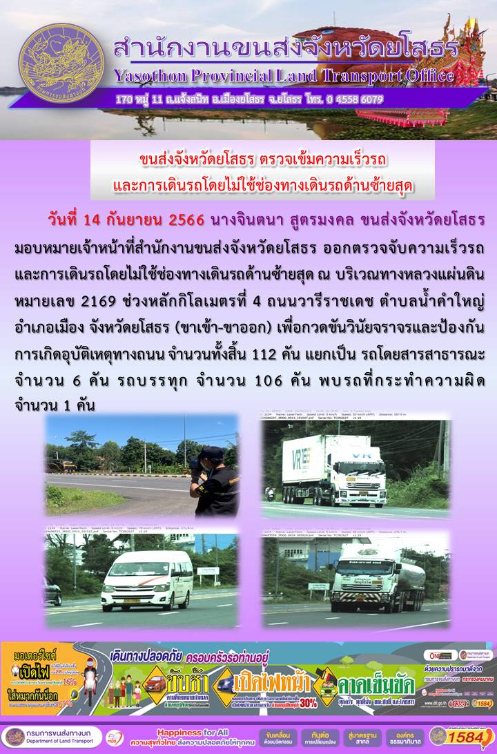 วันที่ 14 กันยายน 2566 เจ้าหน้าที่สำนักงานขนส่งจังหวัดยโสธร ออกตั้งจุดตรวจจับความเร็ว