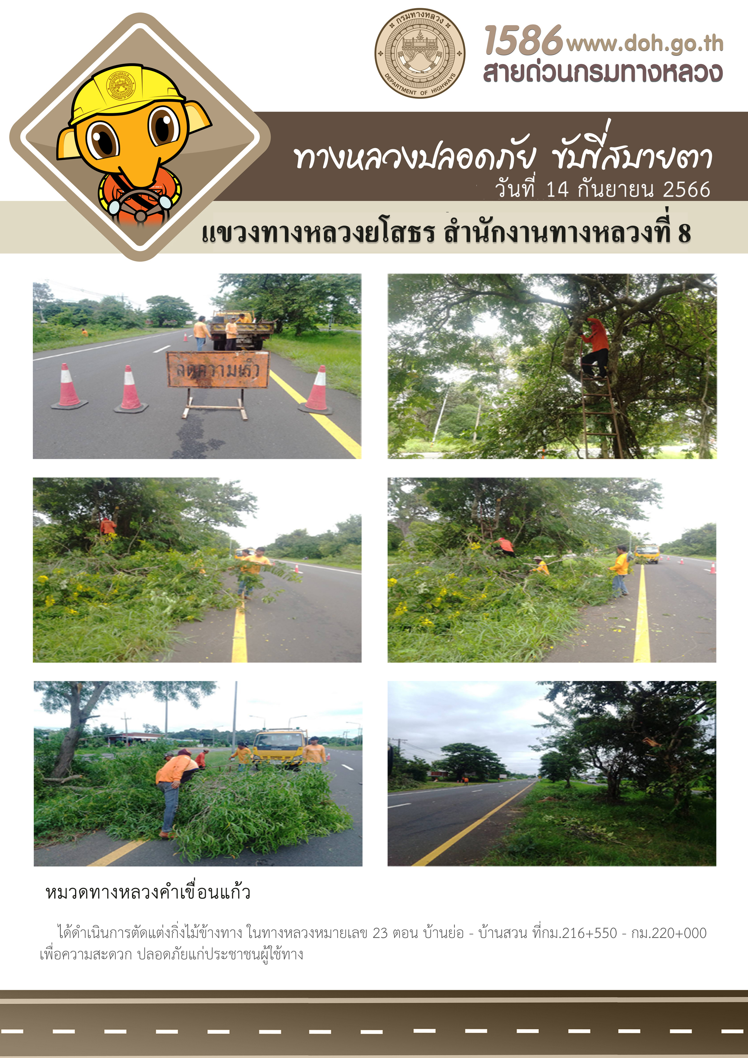 วันที่ 14 กันยายน 2566 หมวดทางหลวงคำเขื่อนแก้ว ได้ดำเนินการตัดแต่งกิ่งไม้ข้างทาง ในทางหลวงหมายเลข 23 ตอน บ้านย่อ - บ้านสวน ที่ กม.216+550 - กม.220+000 เพื่อความสะดวก ปลอดภัยแก่ประชาชนผู้ใช้ทาง