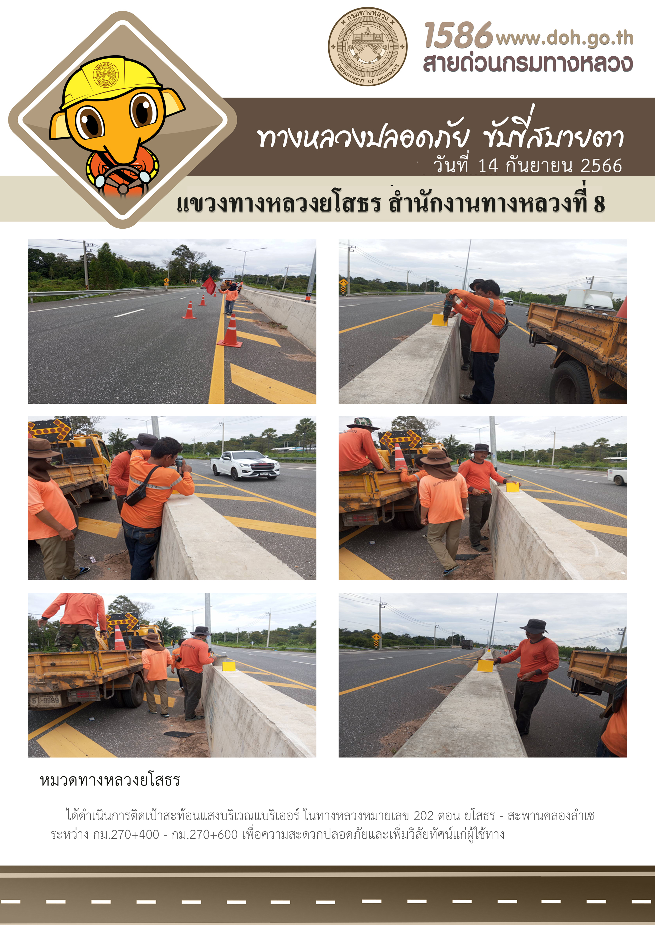 วันที่ 14 กันยายน 2566 หมวดทางหลวงยโสธร ได้ดำเนินการติดตั้งเป้าสะท้อนแสงบริเวณแบริเออร์ ในทางหลวงหมายเลข 202 ตอน ยโสธร - สะพานคลองลำเซ ระหว่าง กม.270+400 - กม.270+600 เพื่อความสะดวกปลอดภัยและเพิ่มวิสัยทัศน์ในการมองเห็นแก่ผู้ใช้ทาง