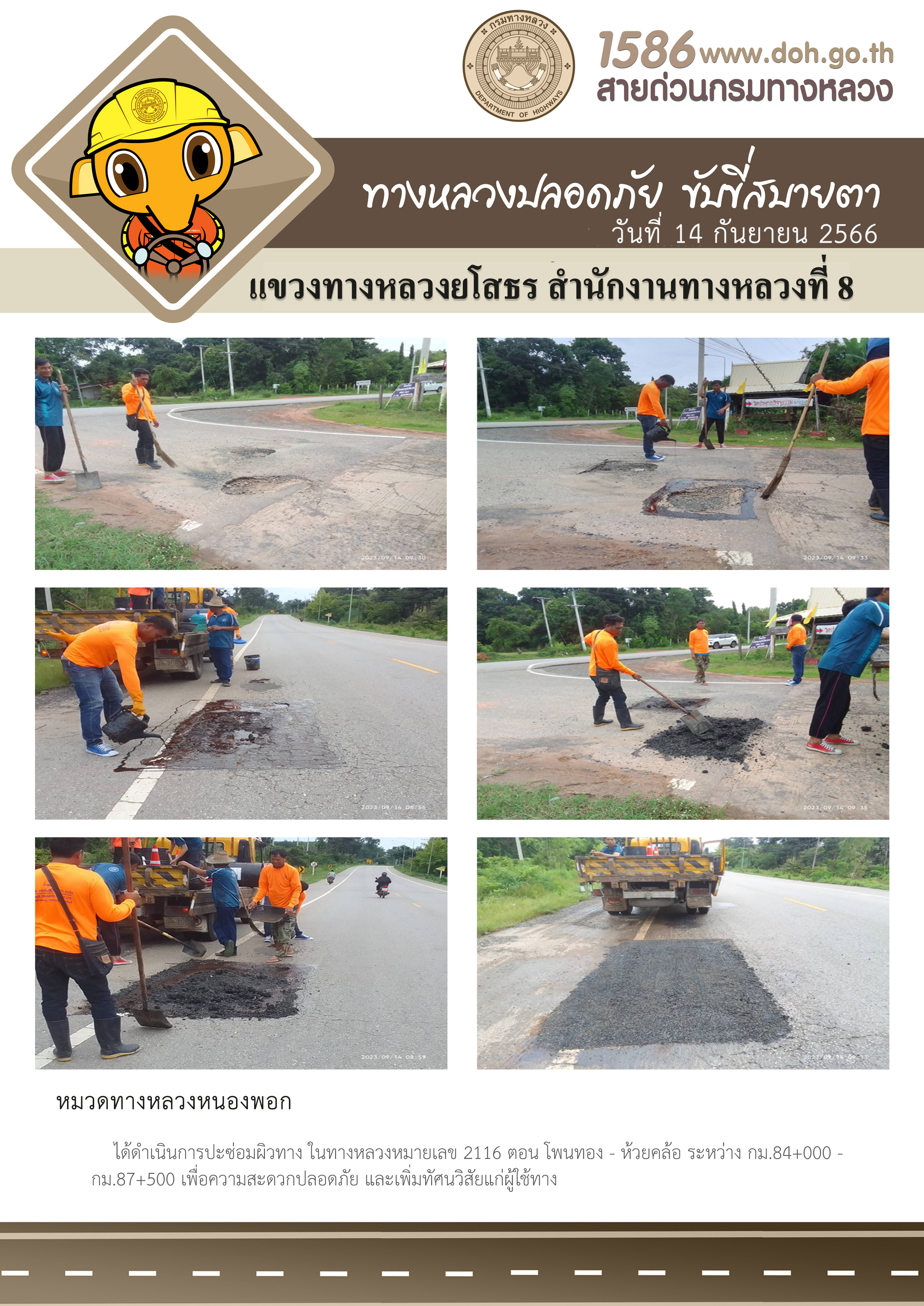 วันที่ 14 กันยายน 2566 หมวดทางหลวงหนองพอก ได้ดำเนินการปะซ่อมผิวทาง ในทางหลวงหมายเลข 2116 ตอน โพนทอง - ห้วยคล้อ ระหว่าง กม.84+000 - กม.87+500 เพื่อความสะดวกปลอดภัย และเพิ่มทัศนวิสัยแก่ผู้ใช้ทาง