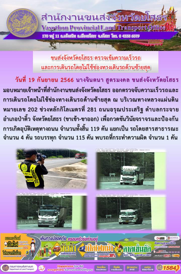 วันที่ 19 กันยายน 2566 เจ้าหน้าที่สำนักงานขนส่งจังหวัดยโสธร ออกตั้งจุดตรวจจับความเร็ว