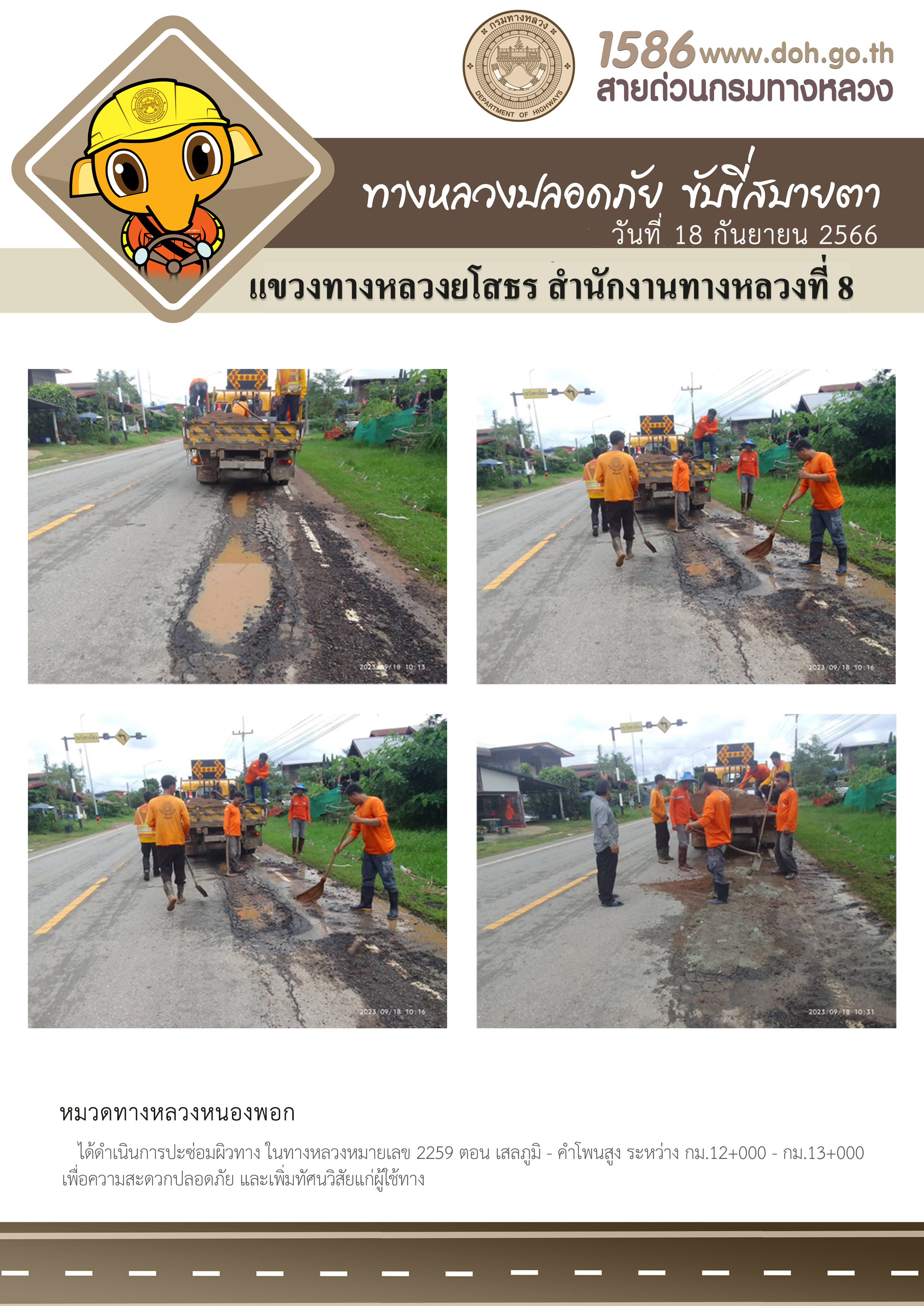 วันที่ 18 กันยายน 2566 หมวดทางหลวงหนองพอก ได้ดำเนินการปะซ่อมผิวทาง ในทางหลวงหมายเลข 2259 ตอน เสลภูมิ - คำโพนสูง ระหว่าง กม.12+000 - กม.13+000 เพื่อความสะดวกปลอดภัย และเพิ่มทัศนวิสัยแก่ผู้ใช้ทาง