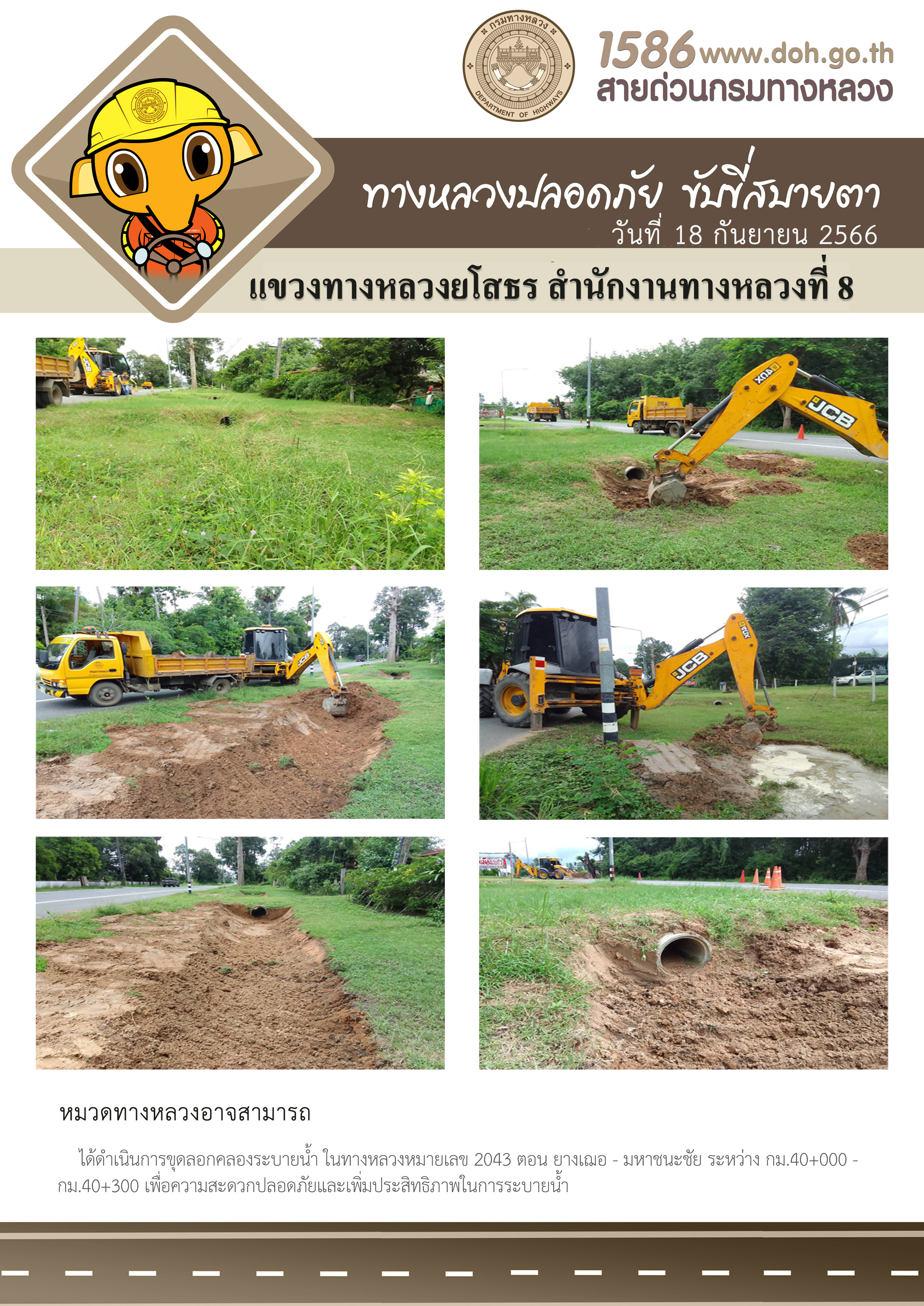วันที่ 18 กันยายน 2566 หมวดทางหลวงอาจสามารถ ได้ดำเนินการขุดลอกคลองระบายน้ำ ในทางหลวงหมายเลข 2043 ตอน ยางเฌอ - มหาชนะชัย ระหว่าง กม.40+000 - กม.40+300 เพื่อความสะดวกปลอดภัยและเพิ่มประสิทธิภาพในการระบายน้ำ