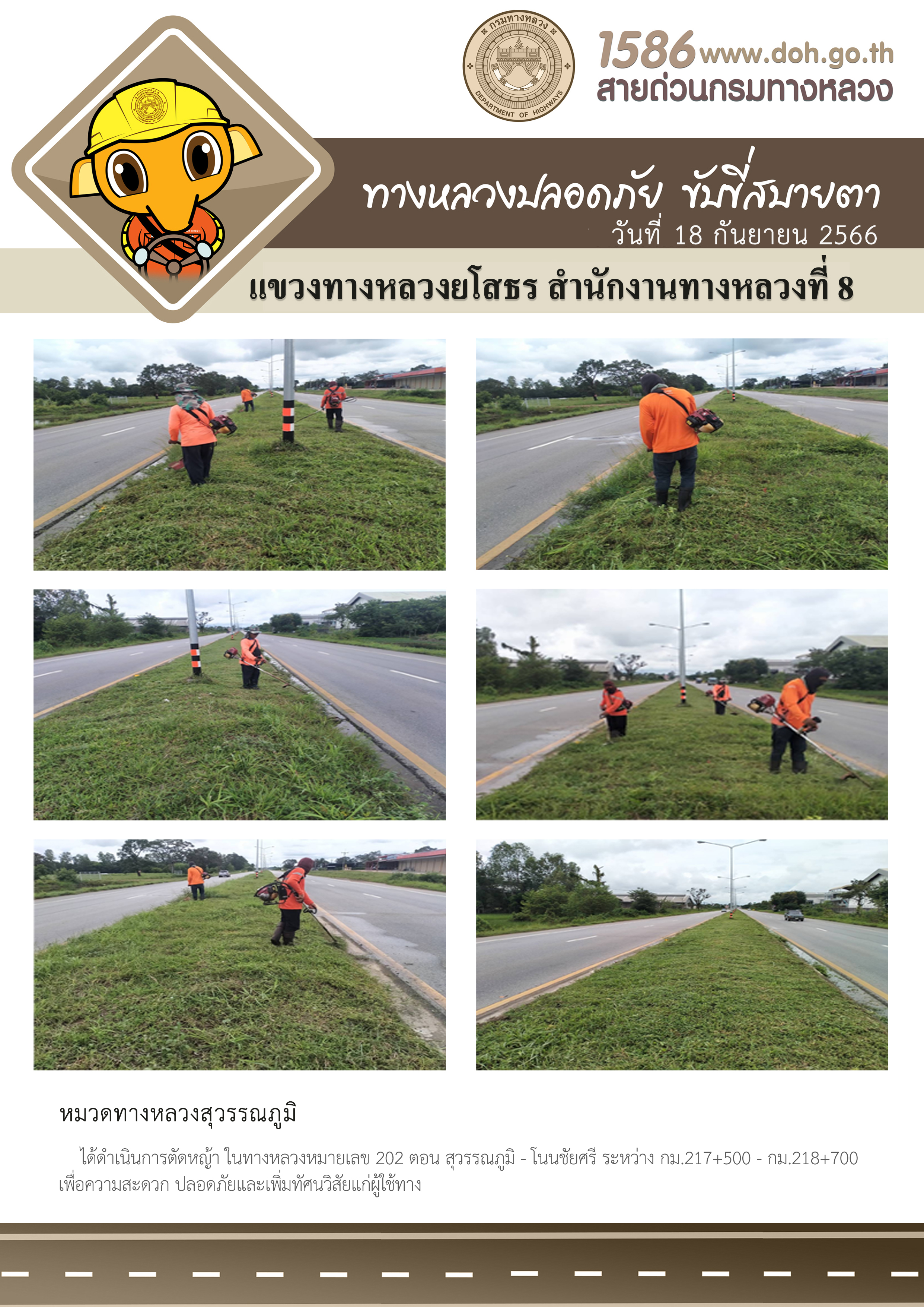 วันที่ 18 กันยายน 2566 หมวดทางหลวงสุวรรณภูมิ ได้ดำเนินการตัดหญ้า ในทางหลวงหมายเลข 202 ตอน สุวรรณภูมิ - โนนชัยศรี ระหว่าง กม.217+500 - กม.218+700 เพื่อความสะดวก ปลอดภัยและเพิ่มทัศนวิสัยแก่ผู้ใช้ทาง