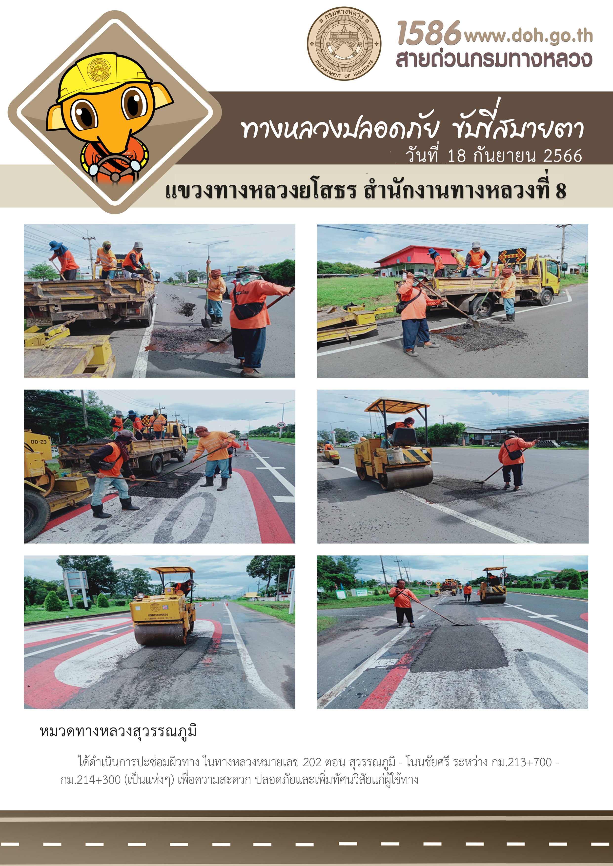 วันที่ 18 กันยายน 2566 หมวดทางหลวงสุวรรณภูมิ ได้ดำเนินการปะซ่อมผิวทาง ในทางหลวงหมายเลข 202 ตอน สุวรรณภูมิ - โนนชัยศรี ระหว่าง กม.213+700 - กม.214+300 (เป็นแห่งๆ) เพื่อความสะดวก ปลอดภัยและเพิ่มทัศนวิสัยแก่ผู้ใช้ทาง