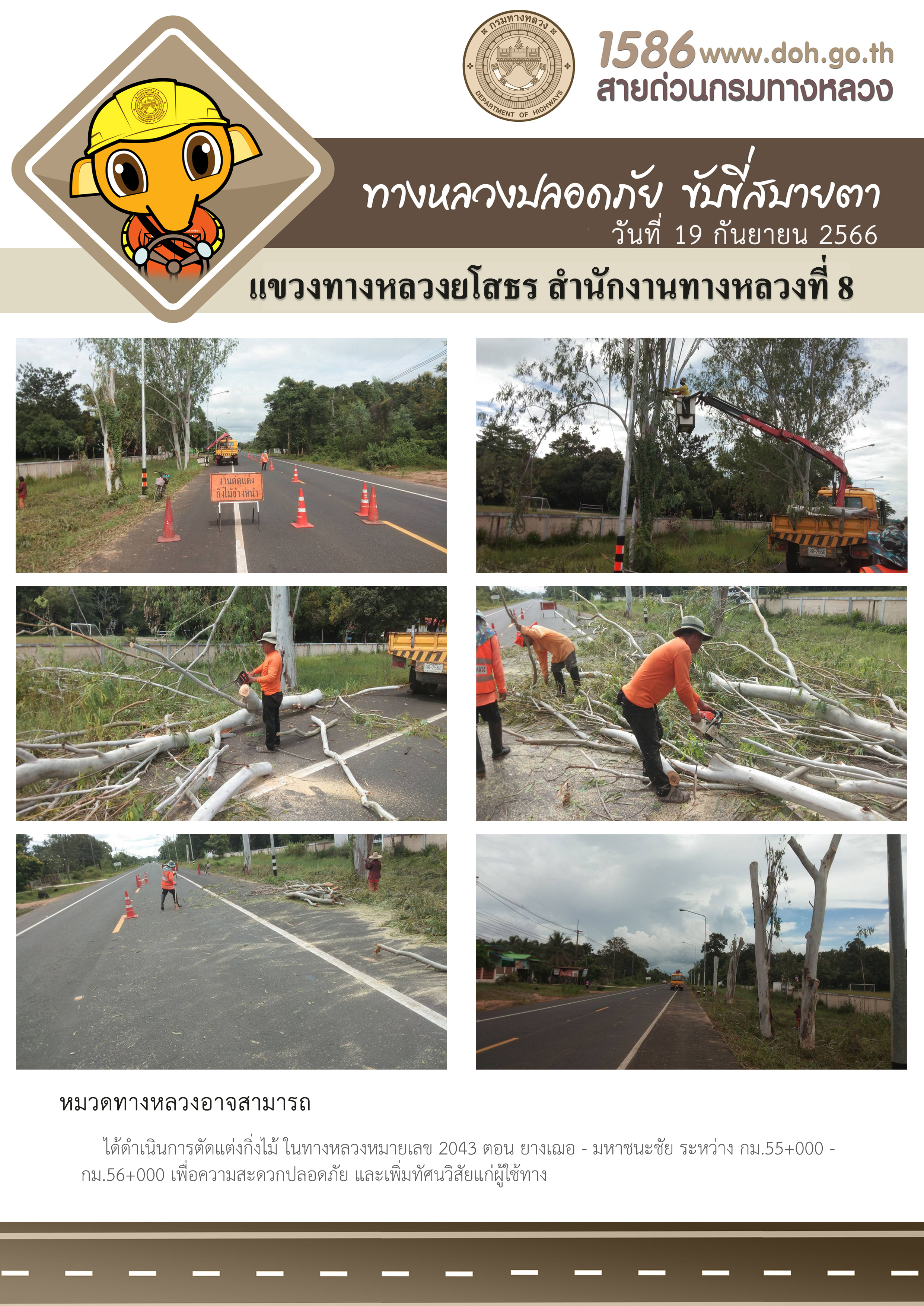 วันที่ 19 กันยายน 2566 หมวดทางหลวงอาจสามารถ ได้ดำเนินการตัดแต่งกิ่งไม้ ในทางหลวงหมายเลข 2043 ตอน ยางเฌอ - มหาชนะชัย ระหว่าง กม.55+000 - กม.56+000 เพื่อความสะดวกปลอดภัย และเพิ่มทัศนวิสัยแก่ผู้ใช้ทาง