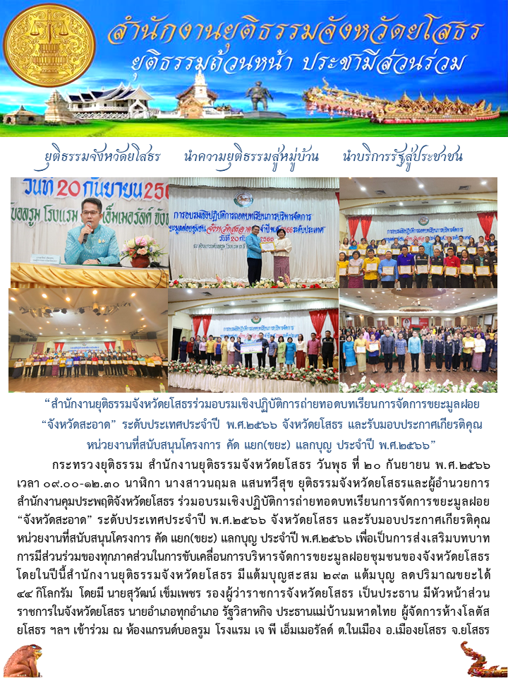 สำนักงานยุติธรรมจังหวัดยโสธรร่วมอบรมเชิงปฏิบัติการถ่ายทอดบทเรียนการจัดการขยะมูลฝอย “จังหวัดสะอาด” ระดับประเทศประจำปี พ.ศ.2566 จังหวัดยโสธร และรับมอบประกาศเกียรติคุณหน่วยงานที่สนับสนุนโครงการ คัด แยก(ขยะ) แลกบุญ ประจำปี พ.ศ.2566