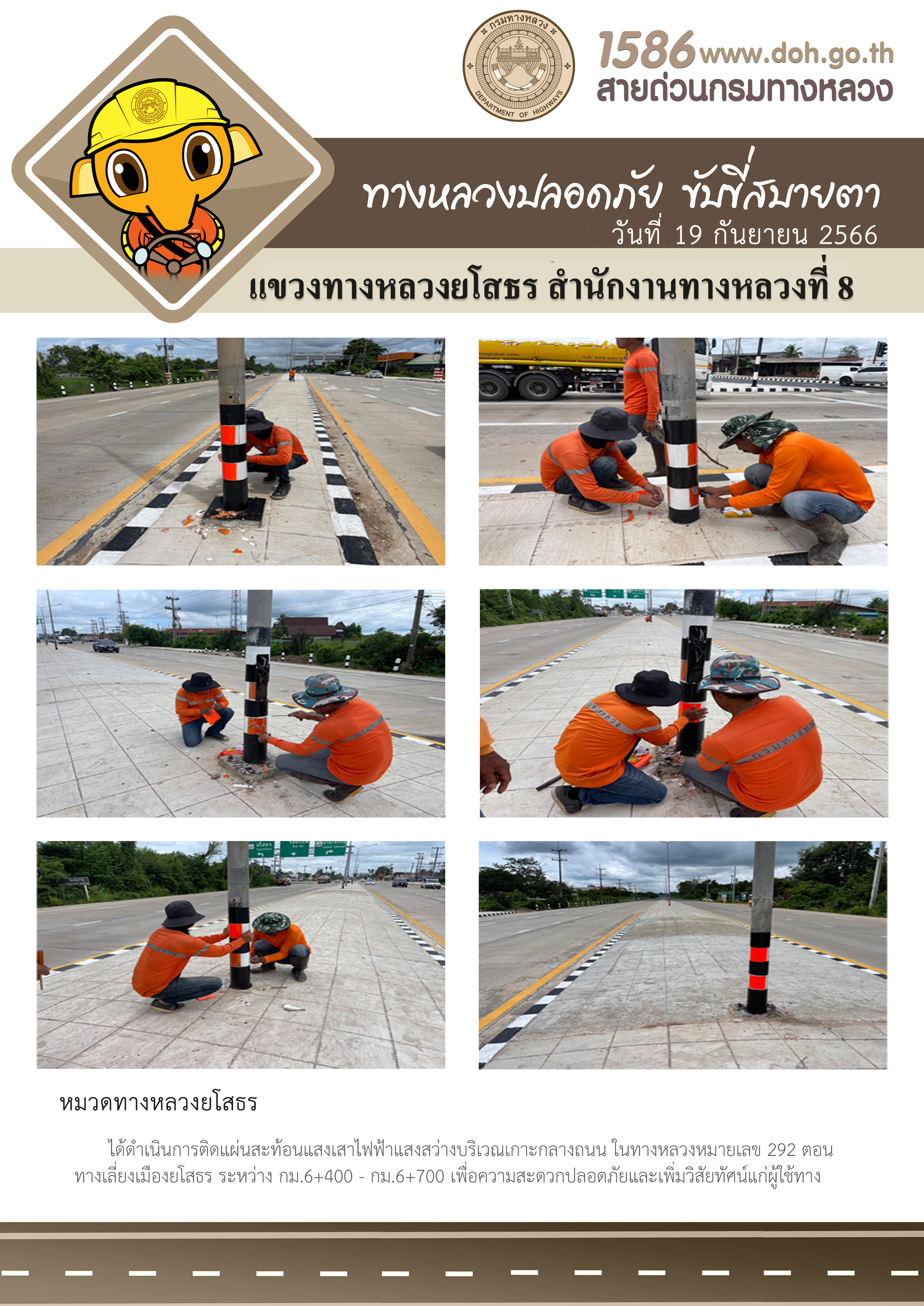 วันที่ 19 กันยายน 2566 หมวดทางหลวงยโสธร ได้ดำเนินการติดแผ่นสะท้อนแสงเสาไฟฟ้าแสงสว่างบริเวณเกาะกลางถนน ในทางหลวงหมายเลข 292 ตอน ทางเลี่ยงเมืองยโสธร ระหว่าง กม.6+400 - กม.6+700 เพื่อความสะดวกปลอดภัยและเพิ่มทัศนวิสัยแก่ผู้ใช้ทาง