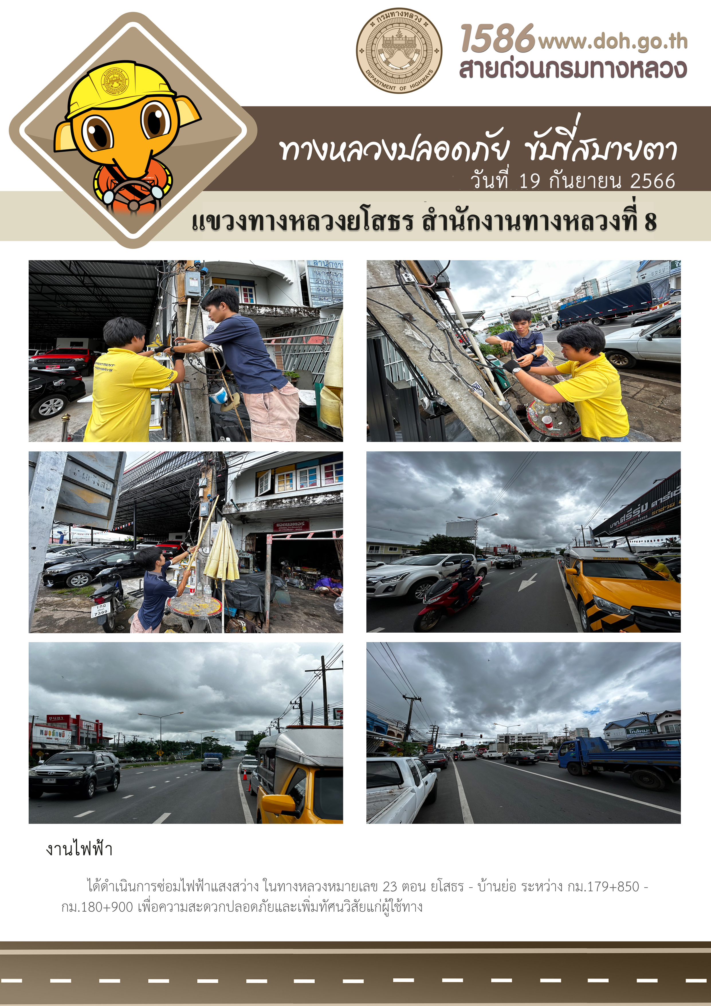 วันที่ 19 กันยายน 2566 งานไฟฟ้า ได้ดำเนินการซ่อมไฟฟ้าแสงสว่าง ในทางหลวงหมายเลข 23 ตอน ยโสธร - บ้านย่อ ระหว่าง กม.179+850 - กม.180+900 เพื่อความสะดวกปลอดภัยและเพิ่มทัศนวิสัยแก่ผู้ใช้ทาง