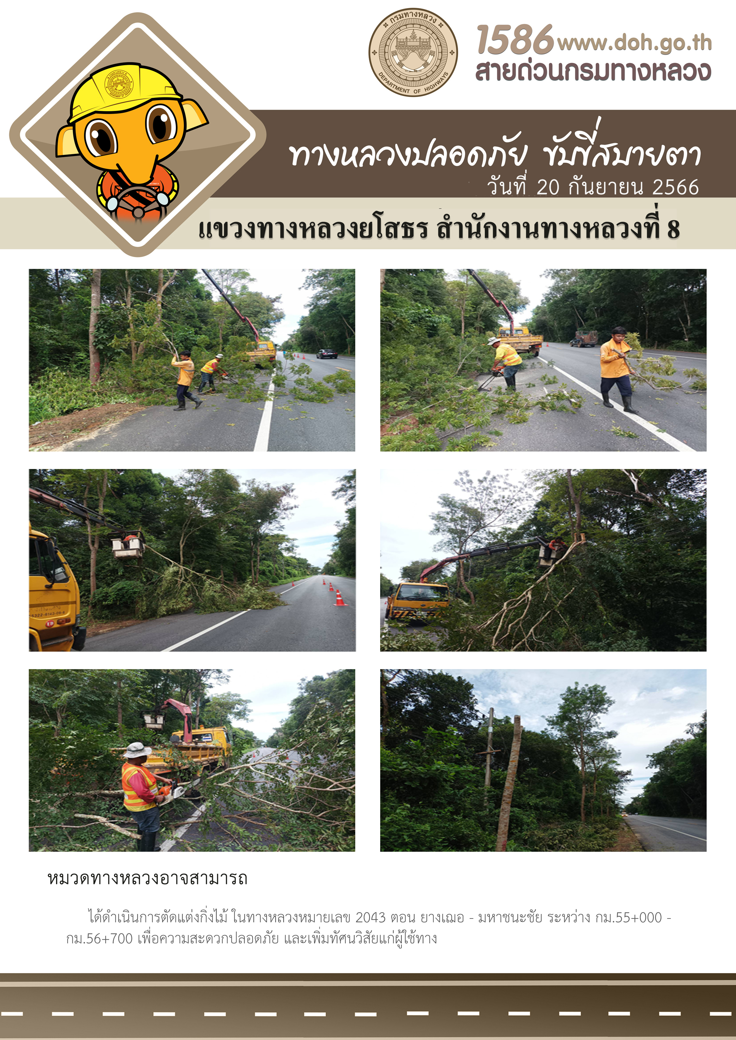 วันที่ 20 กันยายน 2566 หมวดทางหลวงอาจสามารถ ได้ดำเนินการตัดแต่งกิ่งไม้ ในทางหลวงหมายเลข 2043 ตอน ยางเฌอ - มหาชนะชัย ระหว่าง กม.55+000 - กม.56+700 เพื่อความสะดวกปลอดภัย และเพิ่มทัศนวิสัยแก่ผู้ใช้ทาง