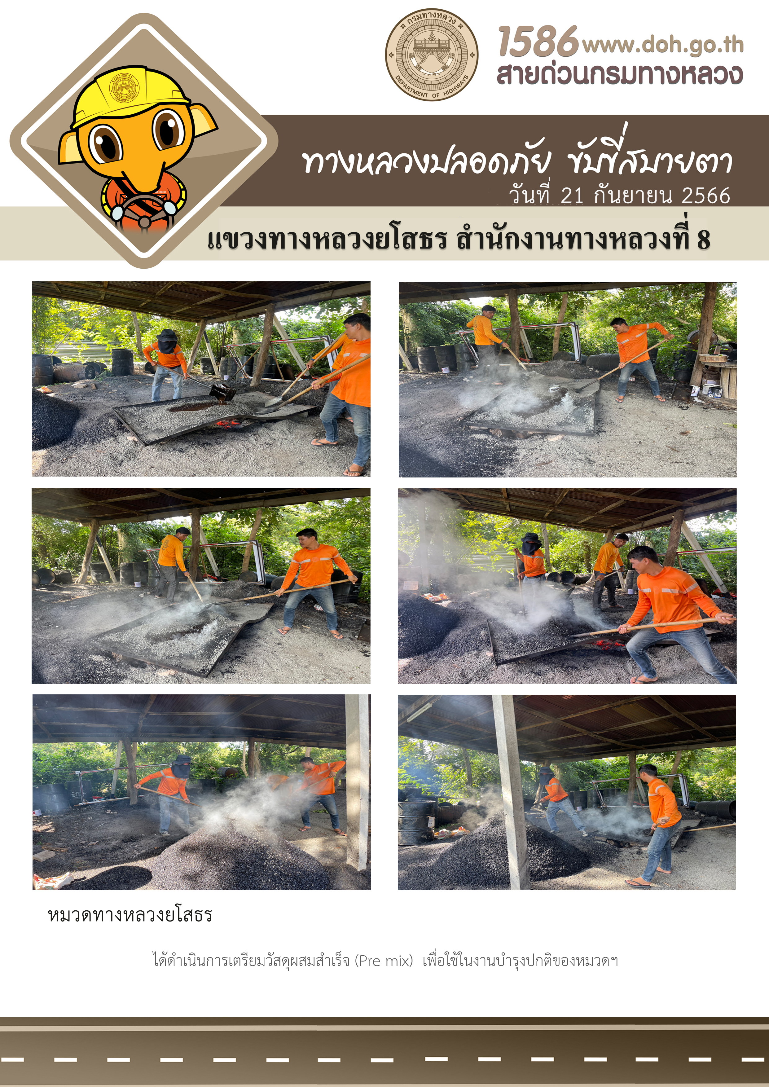 วันที่ 21 กันยายน 2566 หมวดทางหลวงยโสธร ได้ดำเนินการเตรียมวัสดุผสมสำเร็จ (Pre mix) เพื่อใช้ในงานบำรุงปกติของหมวดฯ