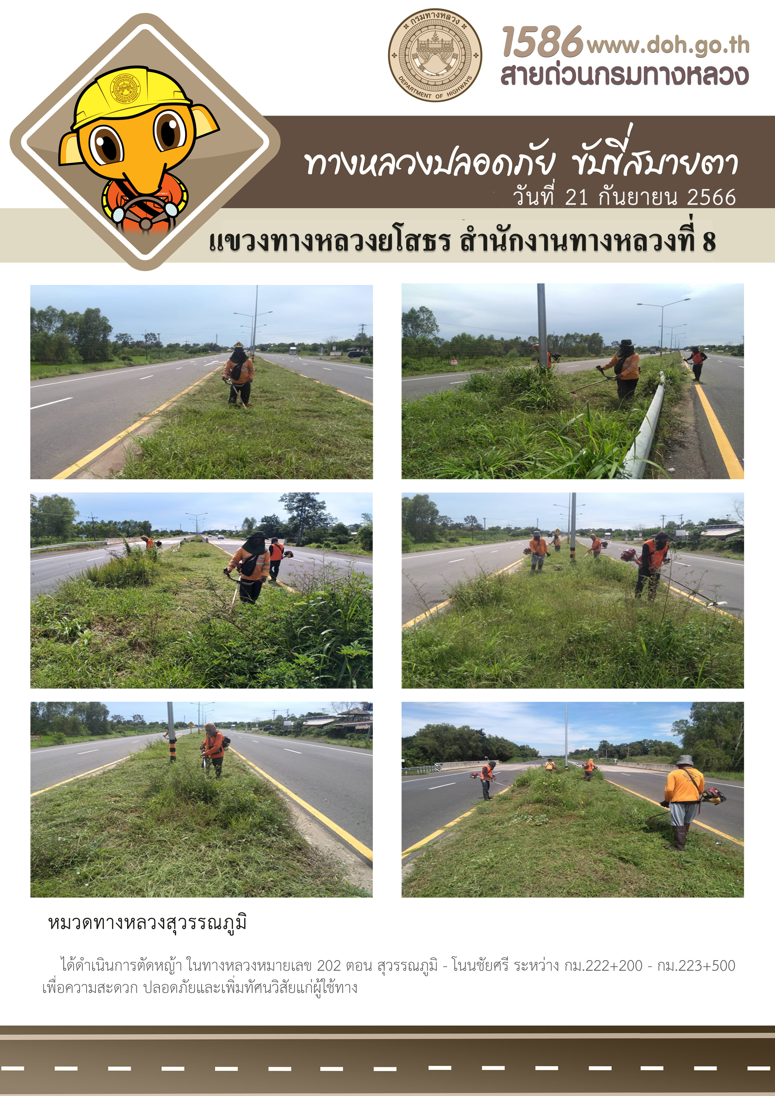 - [10:21] ทั่วไป วันอังคารที่ 31 มีนาคม 2569 งานอำนวยความปลอดภัย ได้ดำเนินการตัดหญ้า ทำความสะอาดภายในบริเวณแขวงทางหลวงยโสธร