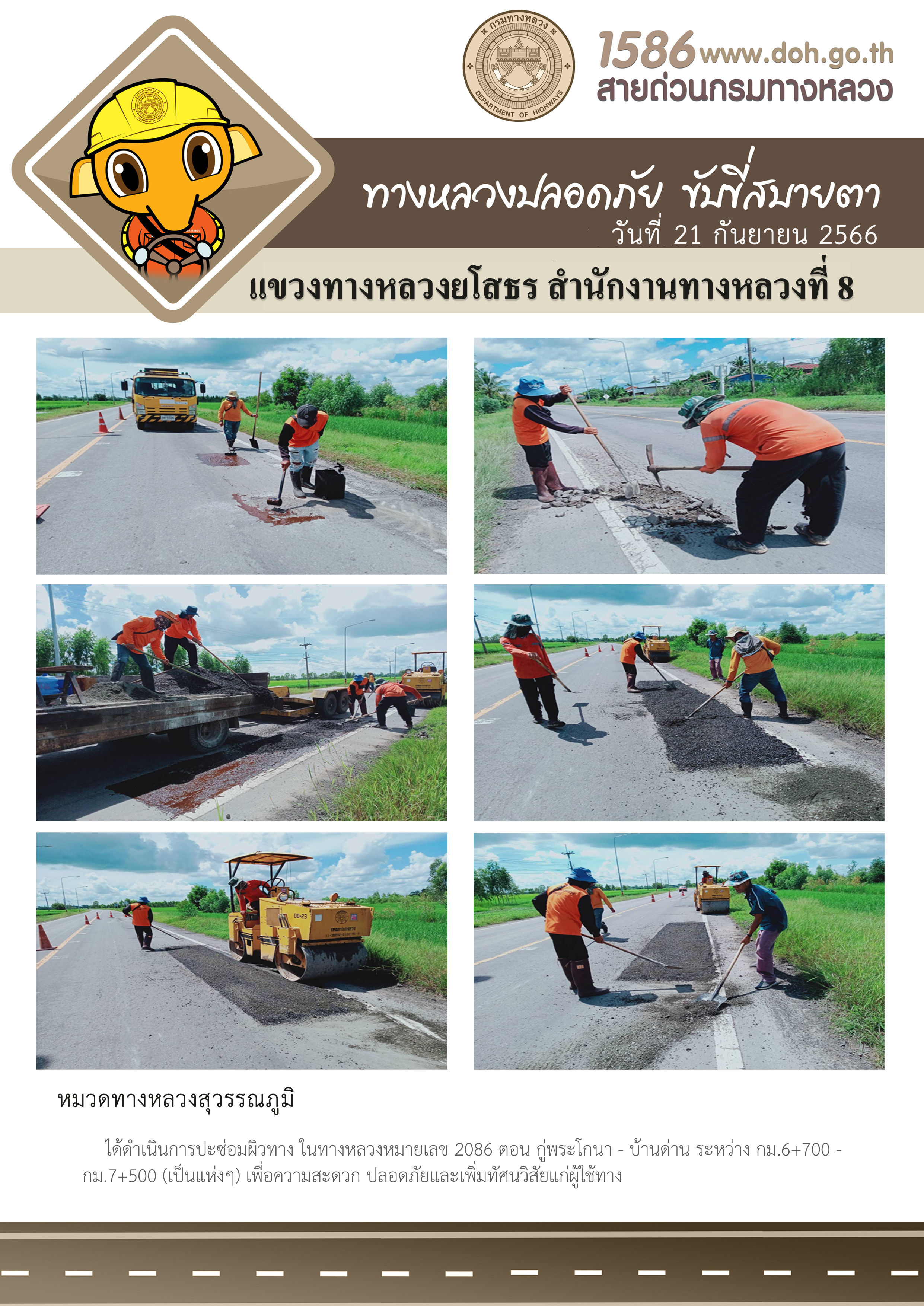 วันที่ 21 กันยายน 2566 หมวดทางหลวงสุวรรณภูมิ ได้ดำเนินการปะซ่อมผิวทาง ในทางหลวงหมายเลข 2086 ตอน กู่พระโกนา - บ้านด่าน ระหว่าง กม.6+700 - กม.7+500 (เป็นแห่งๆ) เพื่อความสะดวกปลอดภัย และเพิ่มทัศนวิสัยแก่ผู้ใช้ทาง