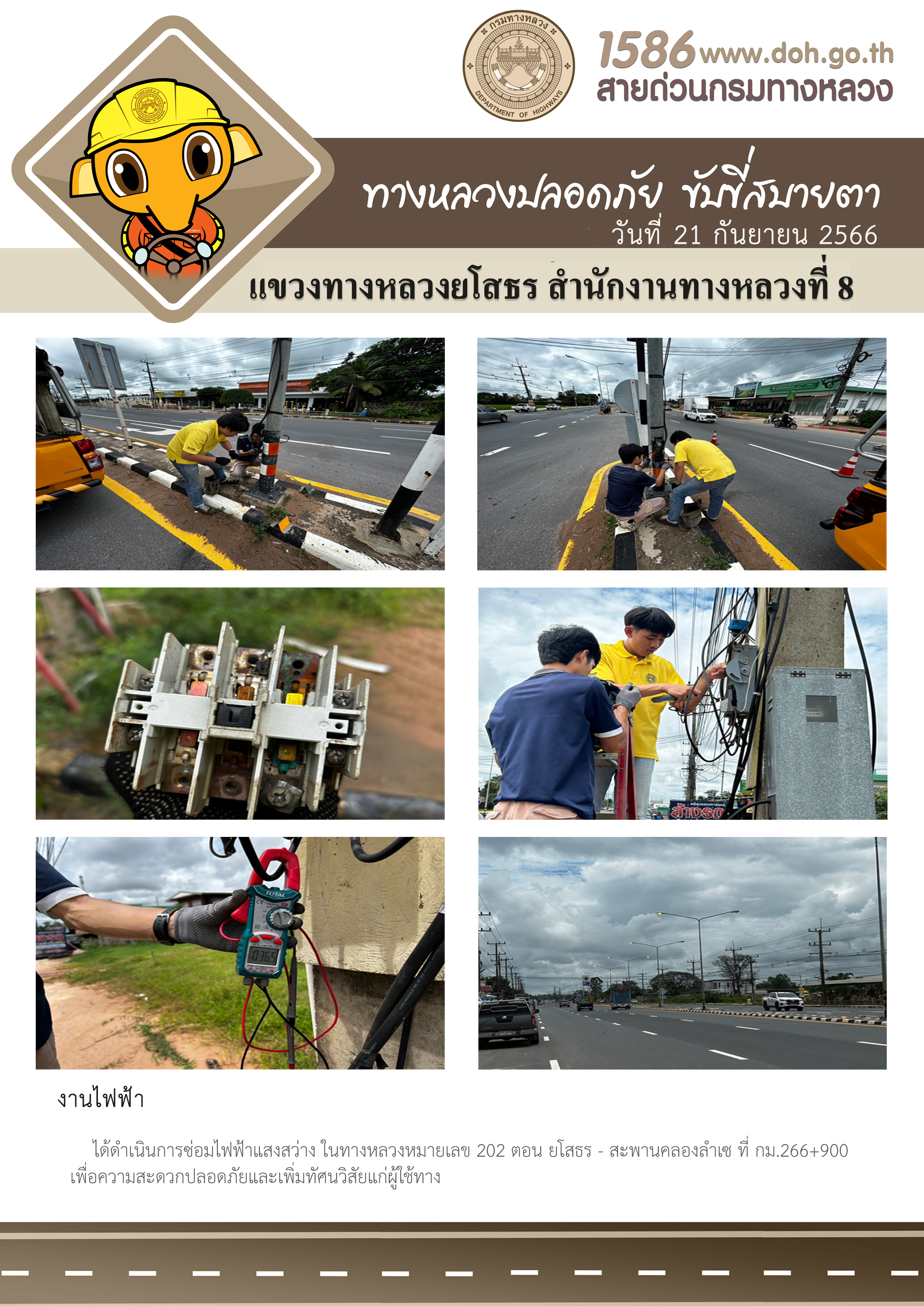 วันที่ 21 กันยายน 2566 งานไฟฟ้า ได้ดำเนินการซ่อมไฟฟ้าแสงสว่าง ในทางหลวงหมายเลข 202 ตอน ยโสธร - สะพานคลองลำเซ ที่ กม.266+900 เพื่อความสะดวกปลอดภัยและเพิ่มทัศนวิสัยแก่ผู้ใช้ทาง