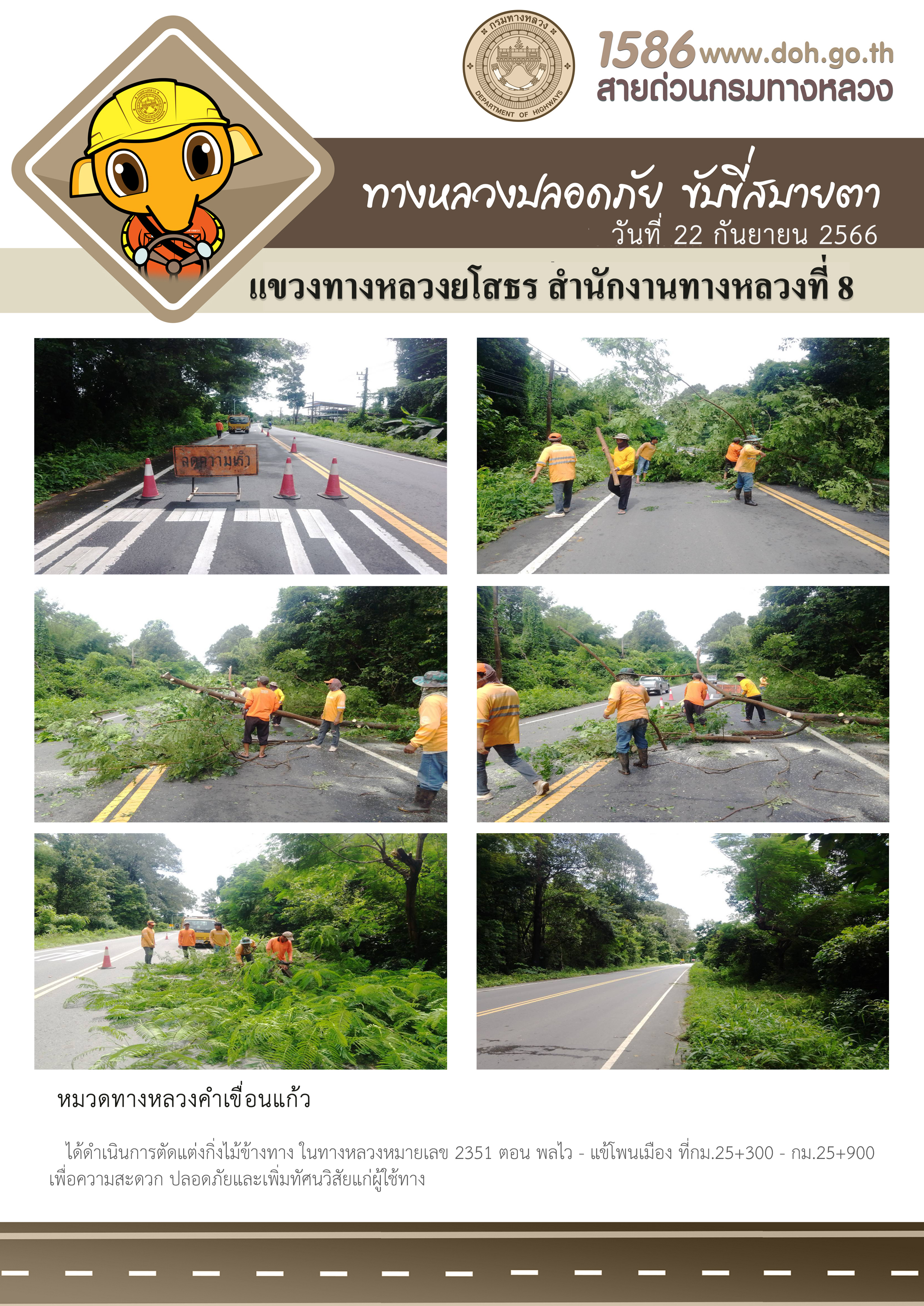 วันที่ 22 กันยายน 2566 หมวดทางหลวงคำเขื่อนแก้ว ได้ดำเนินการตัดแต่งกิ่งไม้ข้างทาง ในทางหลวงหมายเลข 2351 ตอน พลไว - แข้โพนเมือง ที่ กม.25+300 - กม.25+900 เพื่อความสะดวก ปลอดภัยและเพิ่มทัศนวิสัยแก่ผู้ใช้ทาง