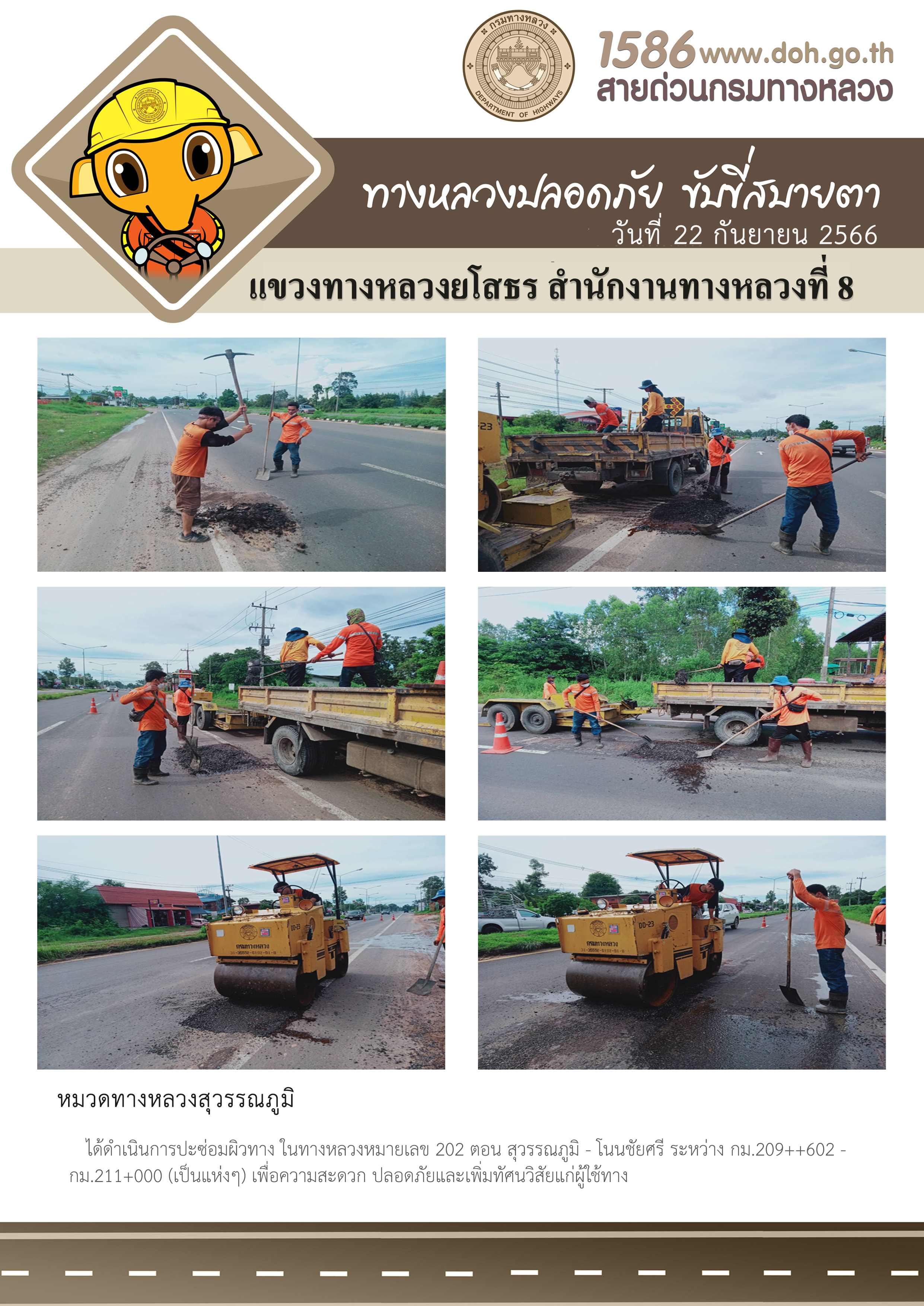 วันที่ 22 กันยายน 2566 หมวดทางหลวงสุวรรณภูมิ ได้ดำเนินการปะซ่อมผิวทาง ในทางหลวงหมายเลข 202 ตอน สุวรรณภูมิ - โนนชัยศรี ระหว่าง กม.209+602 - กม.211+000 (เป็นแห่งๆ) เพื่อความสะดวก ปลอดภัยและเพิ่มทัศนวิสัยแก่ผู้ใช้ทาง