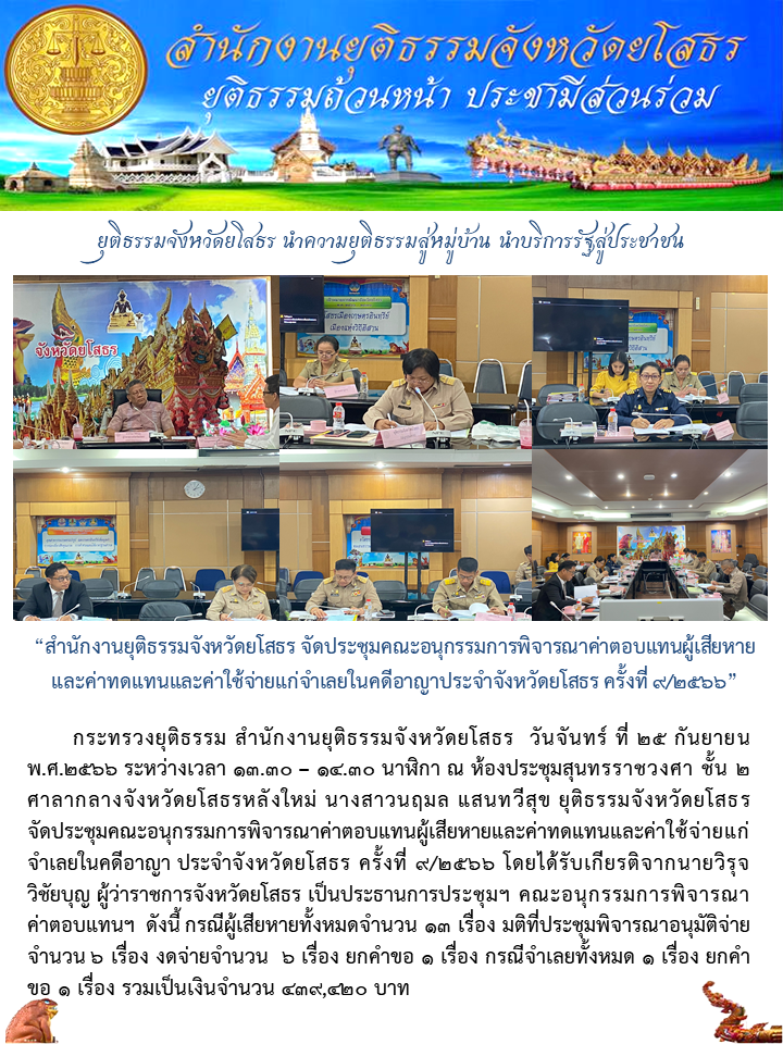 สำนักงานยุติธรรมจังหวัดยโสธร จัดประชุมคณะอนุกรรมการพิจารณาค่าตอบแทนผู้เสียหายและค่าทดแทนและค่าใช้จ่ายแก่จำเลยในคดีอาญาประจำจังหวัดยโสธร ครั้งที่ 9/2566