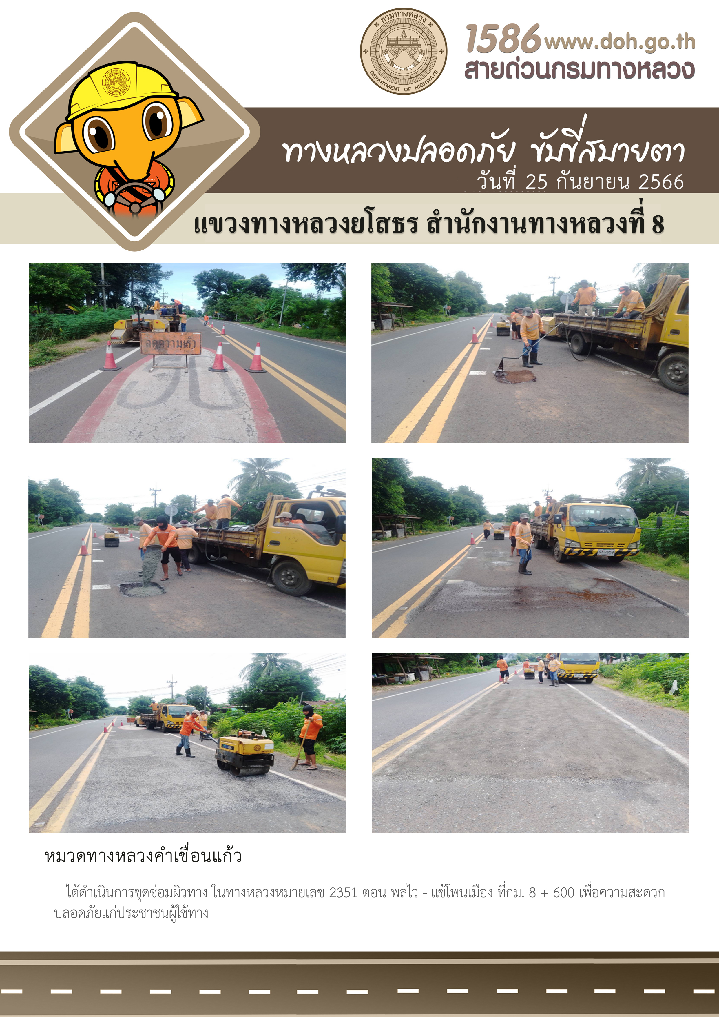 วันที่ 25 กันยายน 2566 หมวดทางหลวงคำเขื่อนแก้ว ได้ดำเนินการขุดซ่อมผิวทาง ในทางหลวงหมายเลข 2351 ตอน พลไว - แข้โพนเมือง ที่ กม.8+600 เพื่อความสะดวก ปลอดภัยแก่ประชาชนผู้ใช้ทาง
