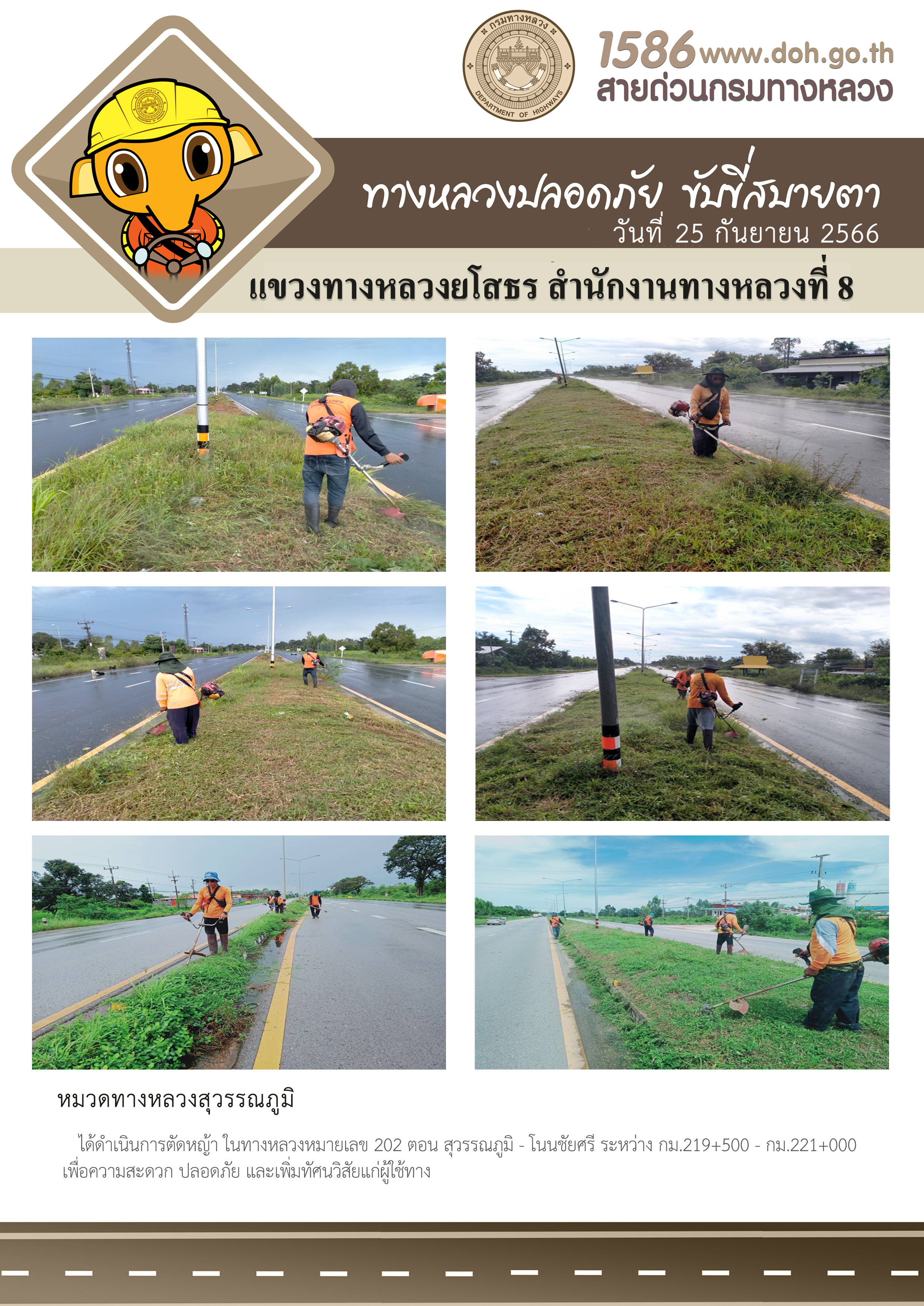 วันที่ 25 กันยายน 2566 หมวดทางหลวงสุวรรณภูมิ ได้ดำเนินการตัดหญ้า ในทางหลวงหมายเลข 202 ตอน สุวรรณภูมิ - โนนชัยศรี ระหว่าง กม.219+500 - กม.221+000 เพื่อความสะดวก ปลอดภัย และเพิ่มทัศนวิสัยแก่ผู้ใช้ทาง