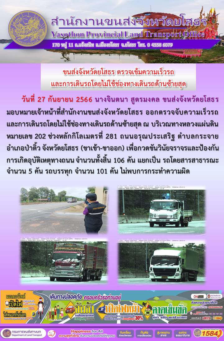 วันที่ 27 กันยายน 2566 เจ้าหน้าที่สำนักงานขนส่งจังหวัดยโสธร ออกตั้งจุดตรวจจับความเร็ว