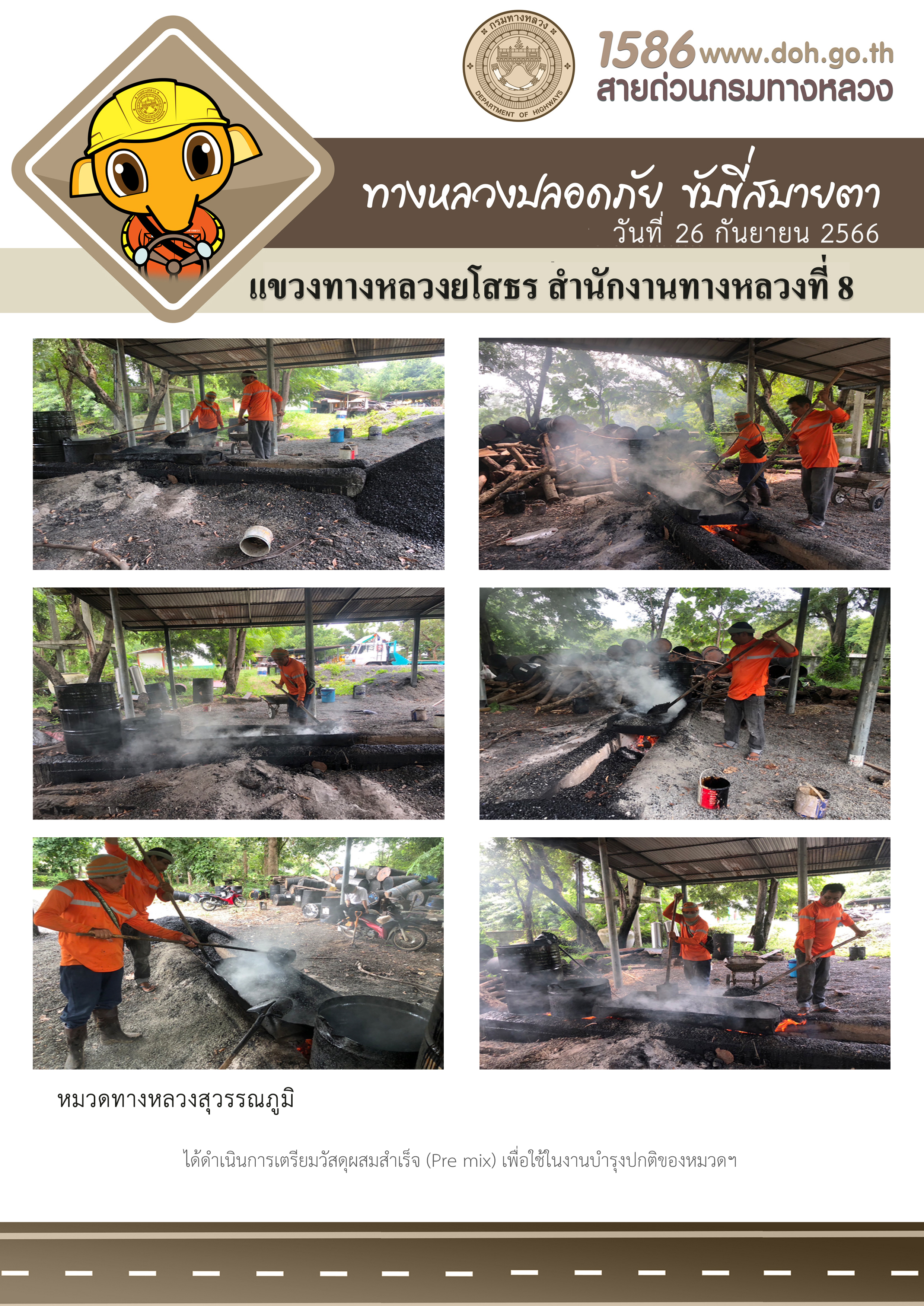 วันที่ 26 กันยายน 2566 หมวดทางหลวงสุวรรณภูมิ ได้ดำเนินการเตรียมวัสดุผสมสำเร็จ (Pre mix) เพื่อใช้ในงานบำรุงปกติของหมวดฯ