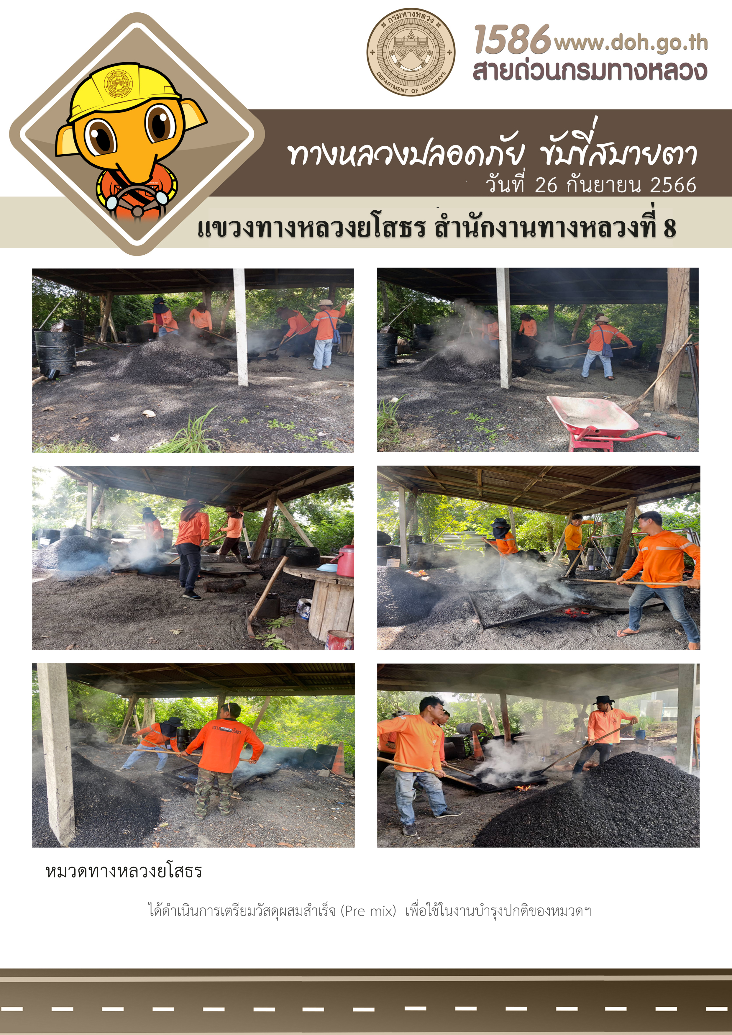 วันที่ 26 กันยายน 2566 หมวดทางหลวงยโสธร ได้ดำเนินการเตรียมวัสดุผสมสำเร็จ (Pre mix) เพื่อใช้ในงานบำรุงปกติของหมวดฯ