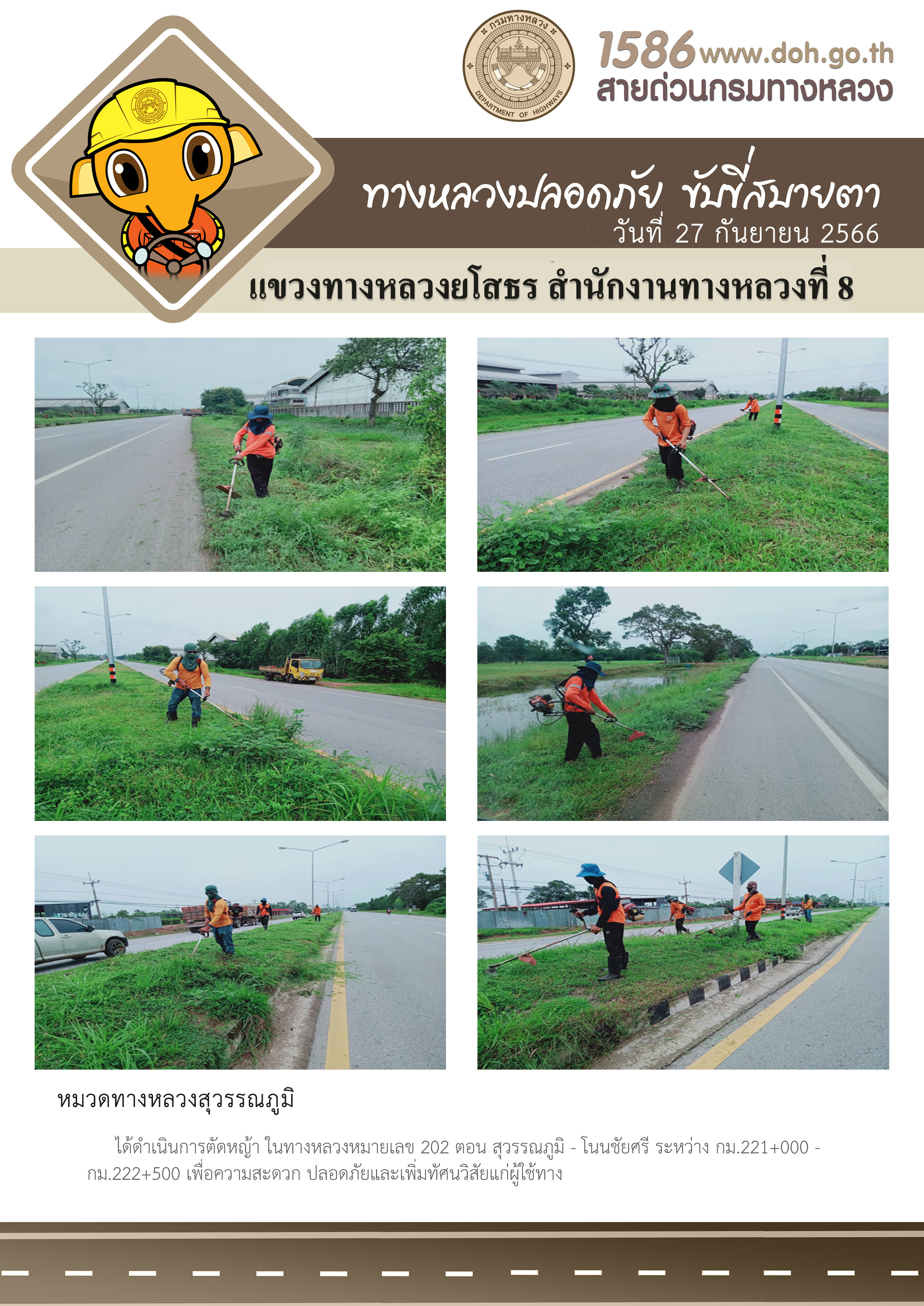 วันที่ 27 กันยายน 2566 หมวดทางหลวงสุวรรณภูมิ ได้ดำเนินการตัดหญ้า ในทางหลวงหมายเลข 202 ตอน สุวรรณภูมิ - โนนชัยศรี ระหว่าง กม.221+000 - กม.222+500 เพื่อความสะดวก ปลอดภัยและเพิ่มทัศนวิสัยแก่ผู้ใช้ทาง