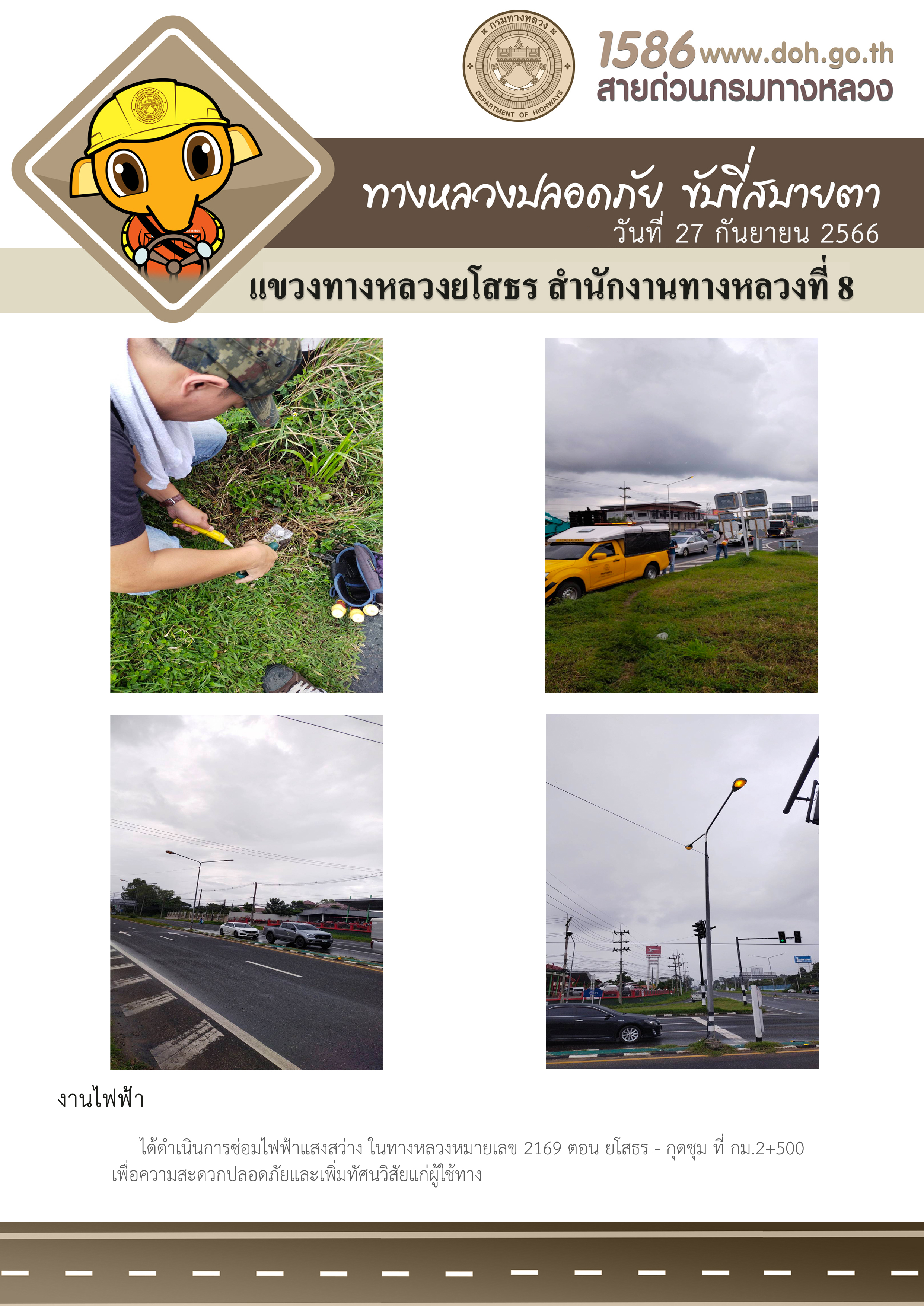 วันที่ 27 กันยายน 2566 งานไฟฟ้า ได้ดำเนินการซ่อมไฟฟ้าแสงสว่าง ในทางหลวงหมายเลข 2169 ตอน ยโสธร - กุดชุม ที่ กม.2+500 เพื่อความสะดวกปลอดภัยและเพิ่มทัศนวิสัยแก่ผู้ใช้ทาง