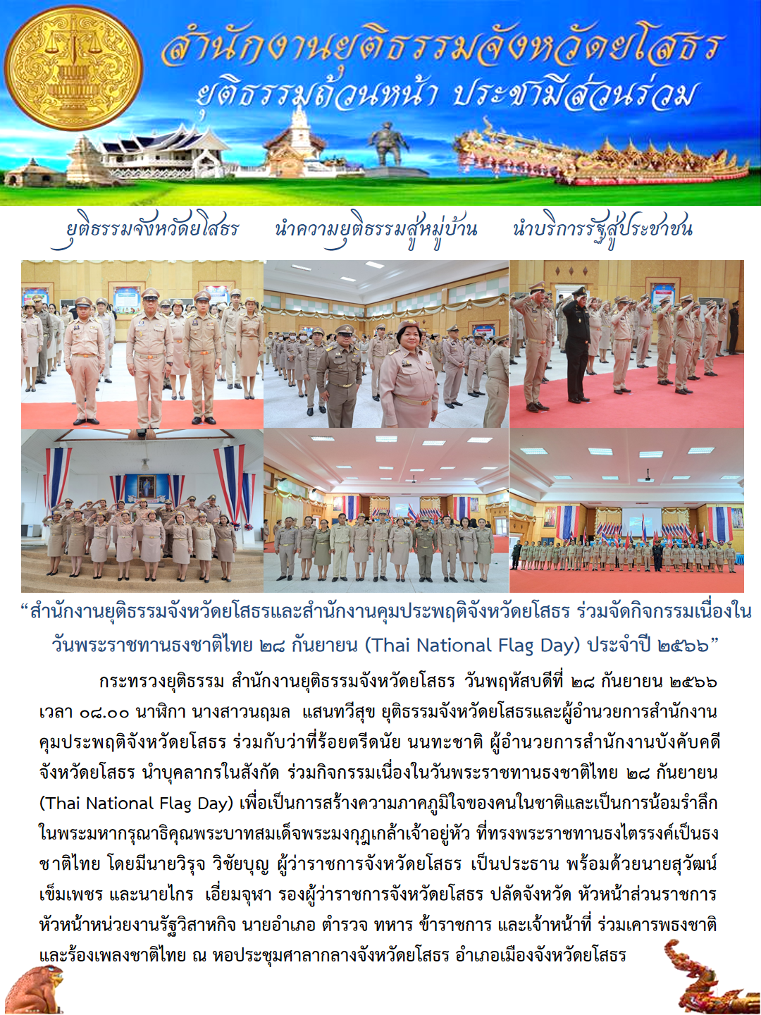 สำนักงานยุติธรรมจังหวัดยโสธรและสำนักงานคุมประพฤติจังหวัดยโสธร ร่วมจัดกิจกรรมเนื่องในวันพระราชทานธงชาติไทย 28 กันยายน (Thai National Flag Day) ประจำปี 2566