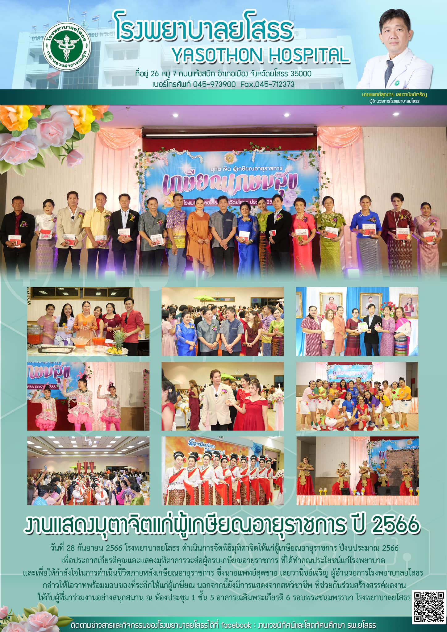 วันที่ 29 ก.ย. 2566 (08:25 น.)วันที่ 28 กันยายน 2566 โรงพยาบาลยโสธร ดำเนินการจัดพิธีมุทิตาจิตให้แก่ผู้เกษียณอายุราชการ ปีงบประมาณ 2566 เพื่อประกาศเกียรติคุณและแสดงมุทิตาคารวะต่อผู้ครบเกษียณอายุราชการ ที่ได้ทำคุณประโยชน์แก่โรงพยาบาล และเพื่อให้กำลังใจในการดำเนินชีวิตภายหลังเกษียณอายุราชการ ซึ่งนายแพทย์สุดชาย เลยวานิชย์เจริญ ผู้อำนวยการโรงพยาบาลยโสธร กล่าวให้โอวาทพร้อมมอบของที่ระลึกให้แก่ผู้เกษียณ นอกจากนี้ยังมีการแสดงจากสหวิชาชีพ ที่ช่วยกันร่วมสร้างสรรค์ผลงานให้กับผู้ที่มาร่วมงานอย่างสนุกสนาน ณ ห้องประชุม 1 ชั้น 5 อาคารเฉลิมพระเกียรติ 6 รอบพระชนมพรรษา โรงพยาบาลยโสธร