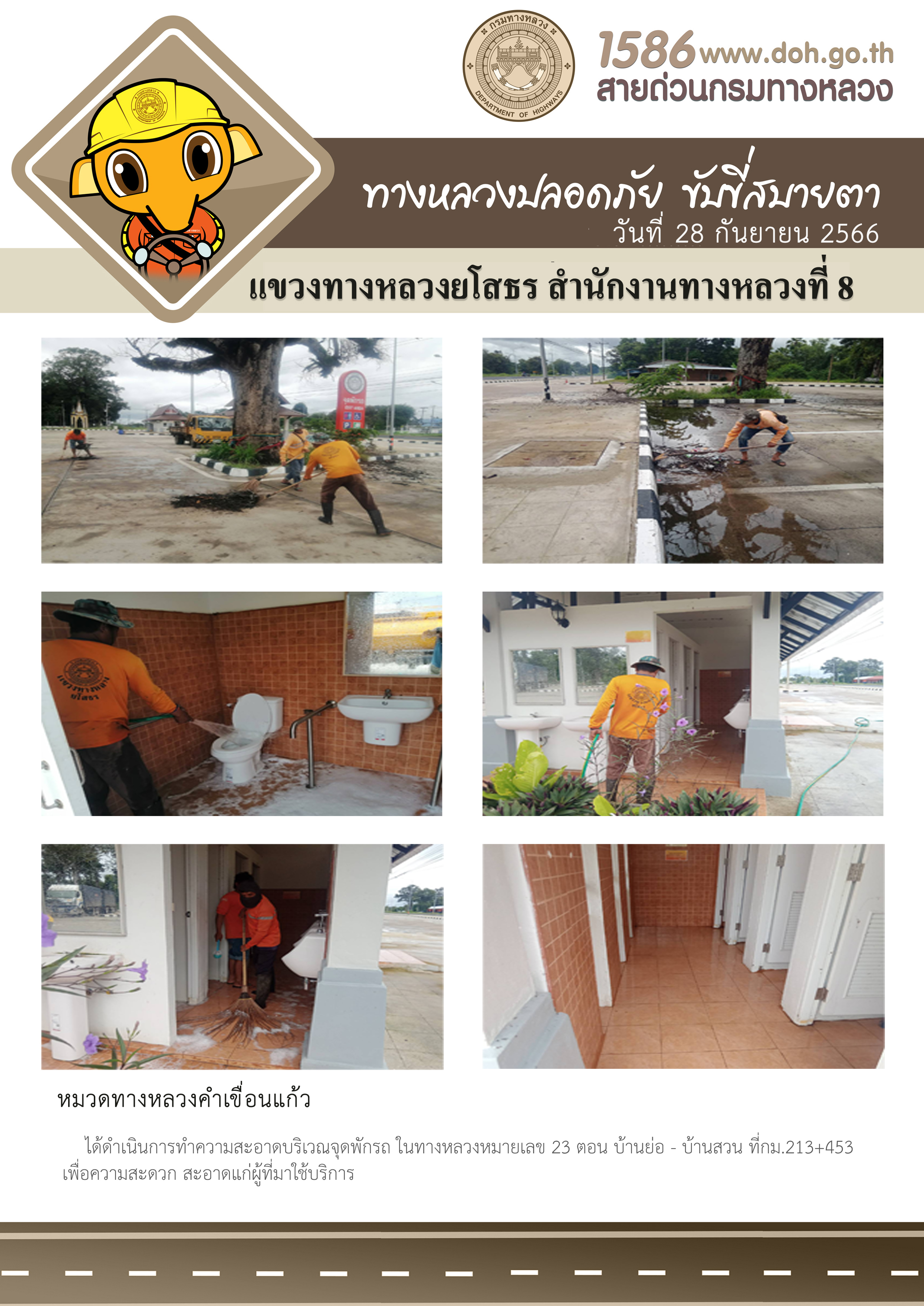 - [10:21] ทั่วไป วันอังคารที่ 31 มีนาคม 2569 งานอำนวยความปลอดภัย ได้ดำเนินการตัดหญ้า ทำความสะอาดภายในบริเวณแขวงทางหลวงยโสธร