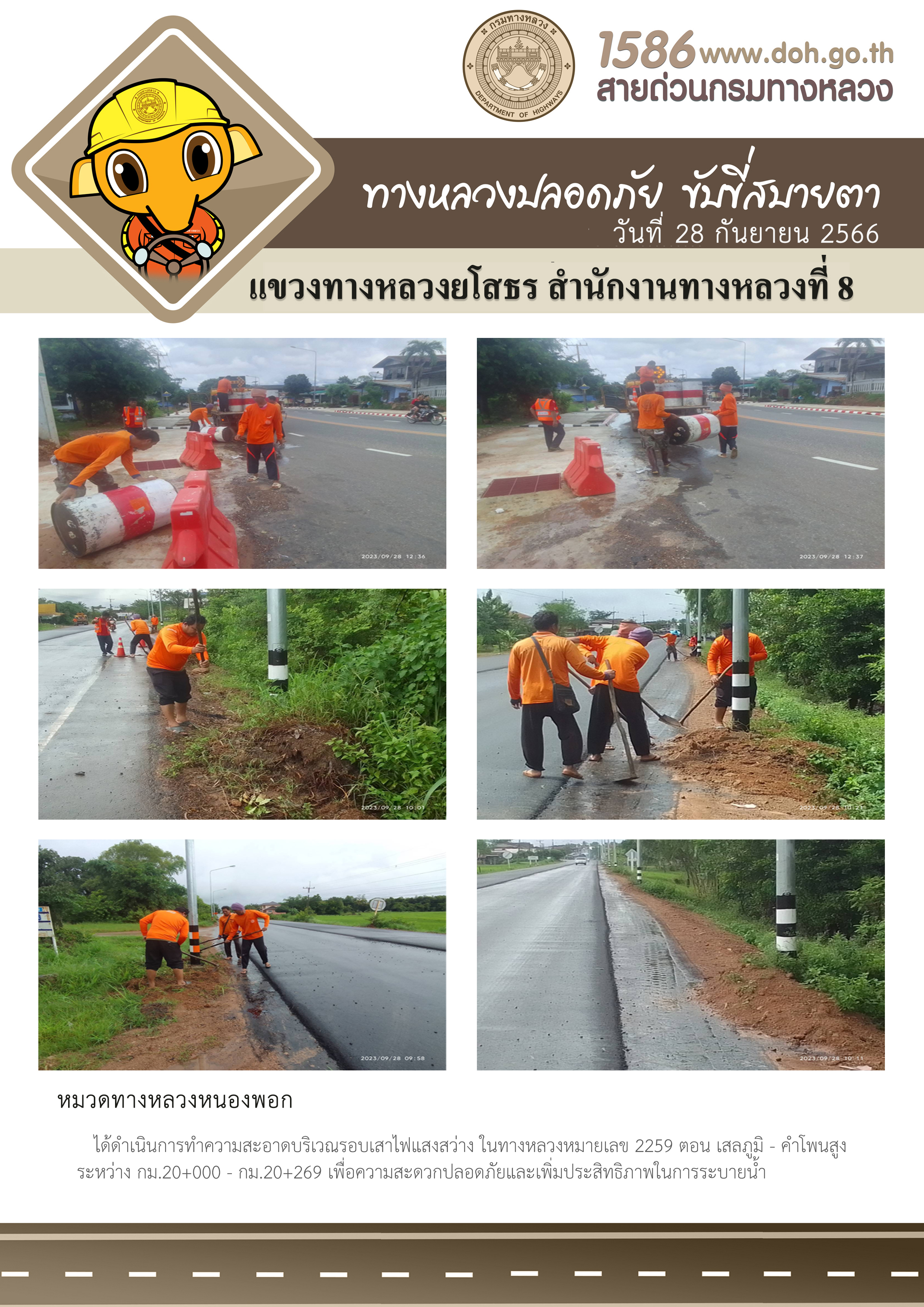 วันที่ 28 กันยายน 2566 หมวดทางหลวงหนองพอก ได้ดำเนินการทำความสะอาดบริเวณรอบเสาไฟแสงสว่าง ในทางหลวงหมายเลข 2259 ตอน เสลภูมิ - คำโพนสูง ระหว่าง กม.20+000 - กม.20+269 เพื่อความสะดวกปลอดภัยและเพิ่มประสิทธิภาพในการระบายน้ำ