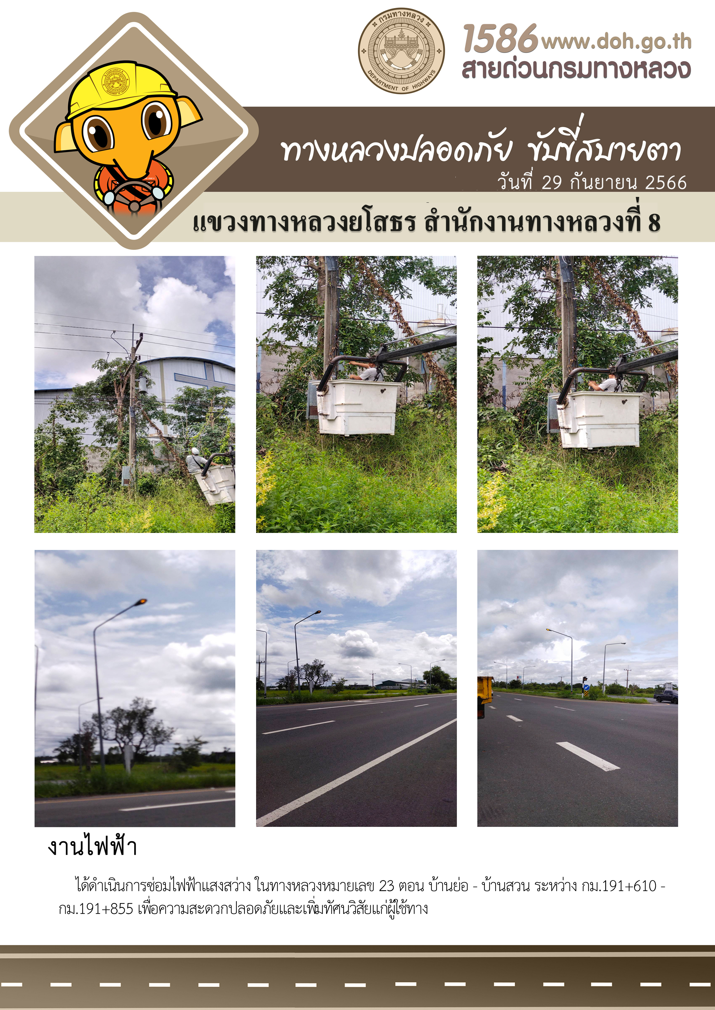 วันที่ 29 กันยายน 2566 งานไฟฟ้า ได้ดำเนินการซ่อมไฟฟ้าแสงสว่าง ในทางหลวงหมายเลข 23 ตอน บ้านย่อ - บ้านสวน ระหว่าง กม.191+610 - กม.191+855 เพื่อความสะดวกปลอดภัยและเพิ่มทัศนวิสัยแก่ผู้ใช้ทาง