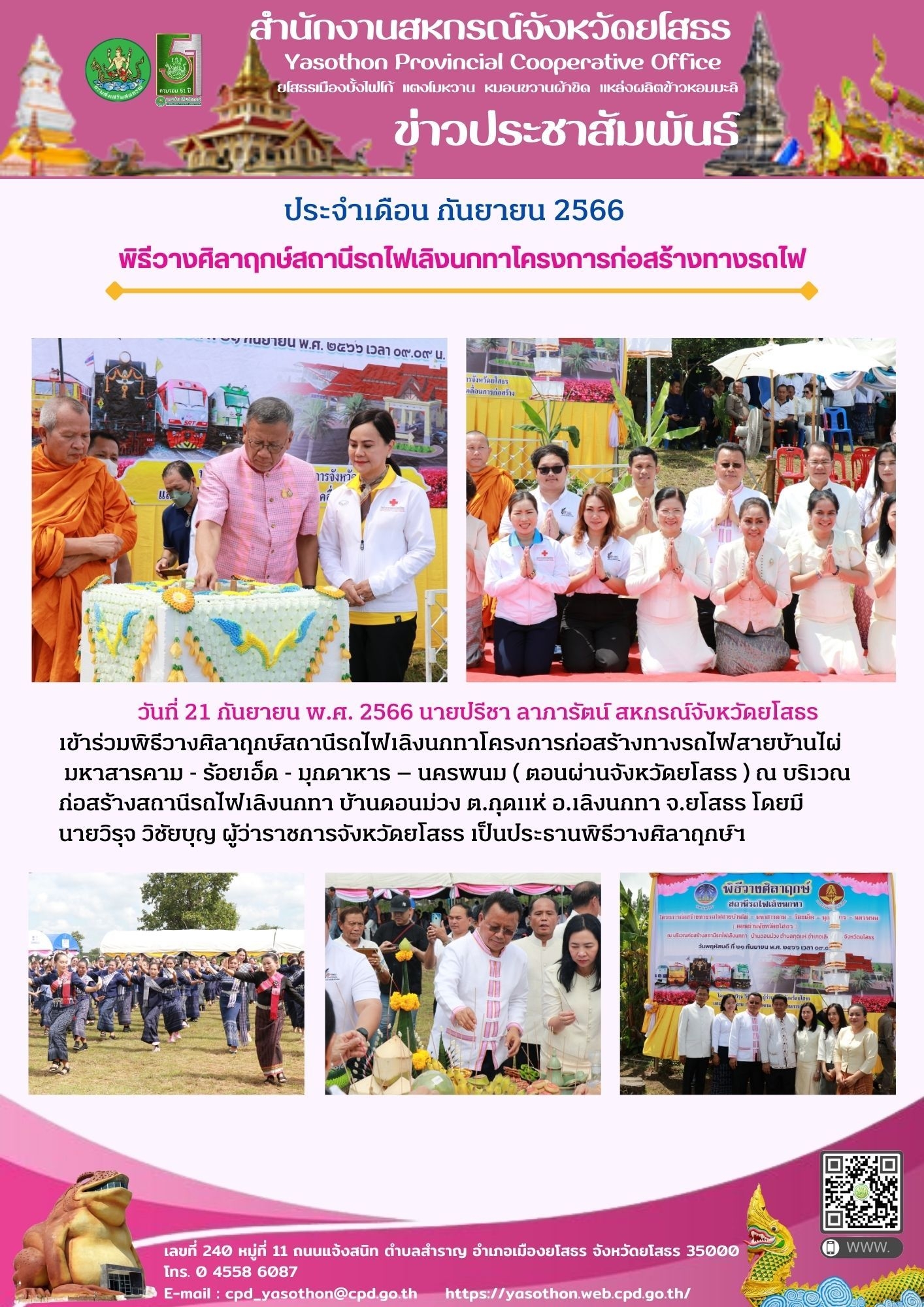 นายปรีชา ลาภารัตน์ สหกรณ์จังหวัดยโสธร เข้าร่วมพิธีวางศิลาฤกษ์สถานีรถไฟเลิงนกทาโครงการก่อสร้างทางรถไฟสายบ้านไผ่-มหาสารคาม-ร้อยเอ็ด-มุกดาหาร-นครพนม ณ บริเวณก่อสร้างสถานีรถไฟเลิงนกทา บ้านดอนม่วง ตำบลกุดแห่ อำเภอเลิงนกทา