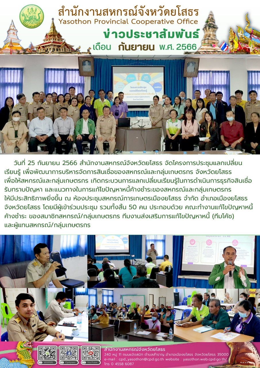 สำนักงานสหกรณ์จังหวัดยโสธร จัดโครงการประชุมแลกเปลี่ยนเรียนรู้ เพื่อพัฒนาการบริหารจัดการสินเชื่อของสหกรณ์และกลุ่มเกษตรกรในจังหวัดยโสธร ณ ห้องประชุมสหกรณ์การเกษตรเมืองยโสธร จำกัด