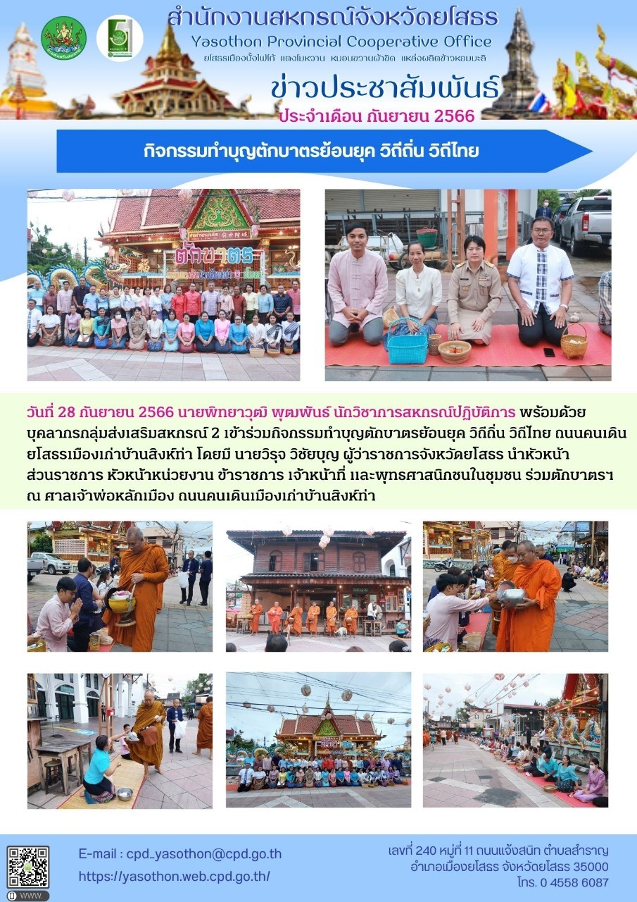 นายพิทยาวุฒิ พุฒพันธ์ นักวิชาการสหกรณ์ปฏิบัติการ พร้อมด้วยบุคลากรกลุ่มส่งเสริมสหกรณ์ 2 เข้าร่วมกิจกรรมทำบุญตักบาตรย้อนยุค วิถีถิ่น วิถีไทย ถนนคนเดิน ณ ศาลเจ้าพ่อหลักเมือง ถนนคนเดินเมืองเก่าบ้านสิงห์ท่า