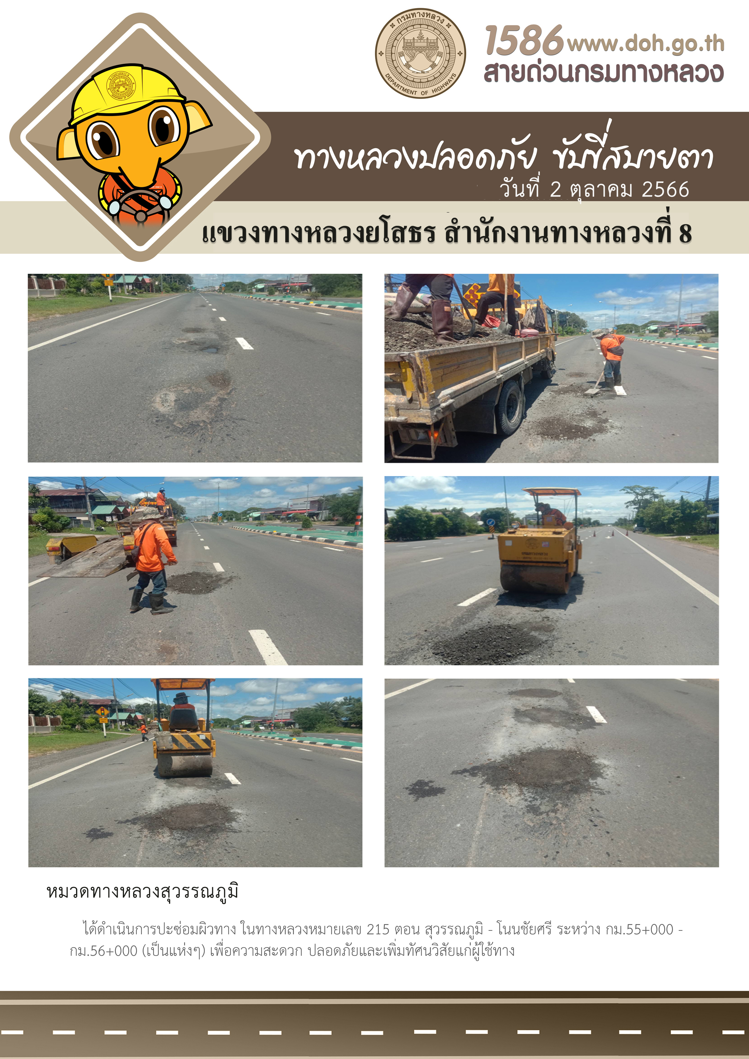 วันที่ 2 ตุลาคม 2566 หมวดทางหลวงสุวรรณภูมิ ได้ดำเนินการปะซ่อมผิวทาง ในทางหลวงหมายเลข 215 ตอน สุวรรณภูมิ - โนนชัยศรี ระหว่าง กม.55+000 - กม.56+000 (เป็นแห่งๆ) เพื่อความสะดวก ปลอดภัยและเพิ่มทัศนวิสัยแก่ผู้ใช้ทาง