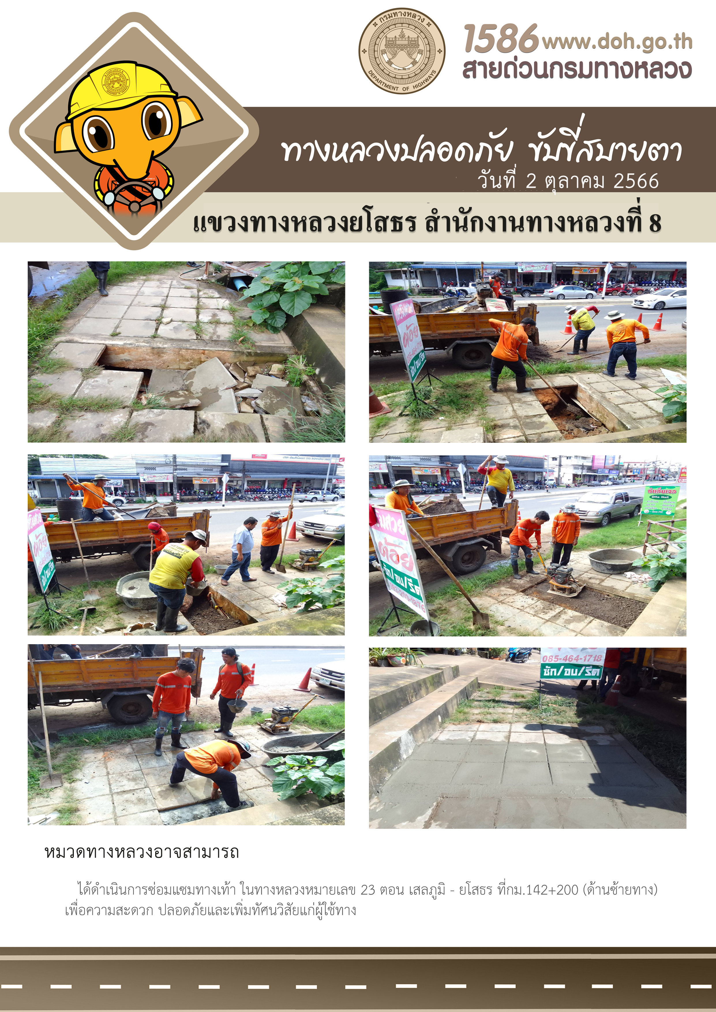วันที่ 2 ตุลาคม 2566 หมวดทางหลวงอาจสามารถ ได้ดำเนินการซ่อมแซมทางเท้า ในทางหลวงหมายเลข 23 ตอน เสลภูมิ - ยโสธร ที่ กม.142+200 (ด้านซ้ายทาง) เพื่อความสะดวก ปลอดภัยและเพิ่มทัศนวิสัยแก่ผู้ใช้ทาง