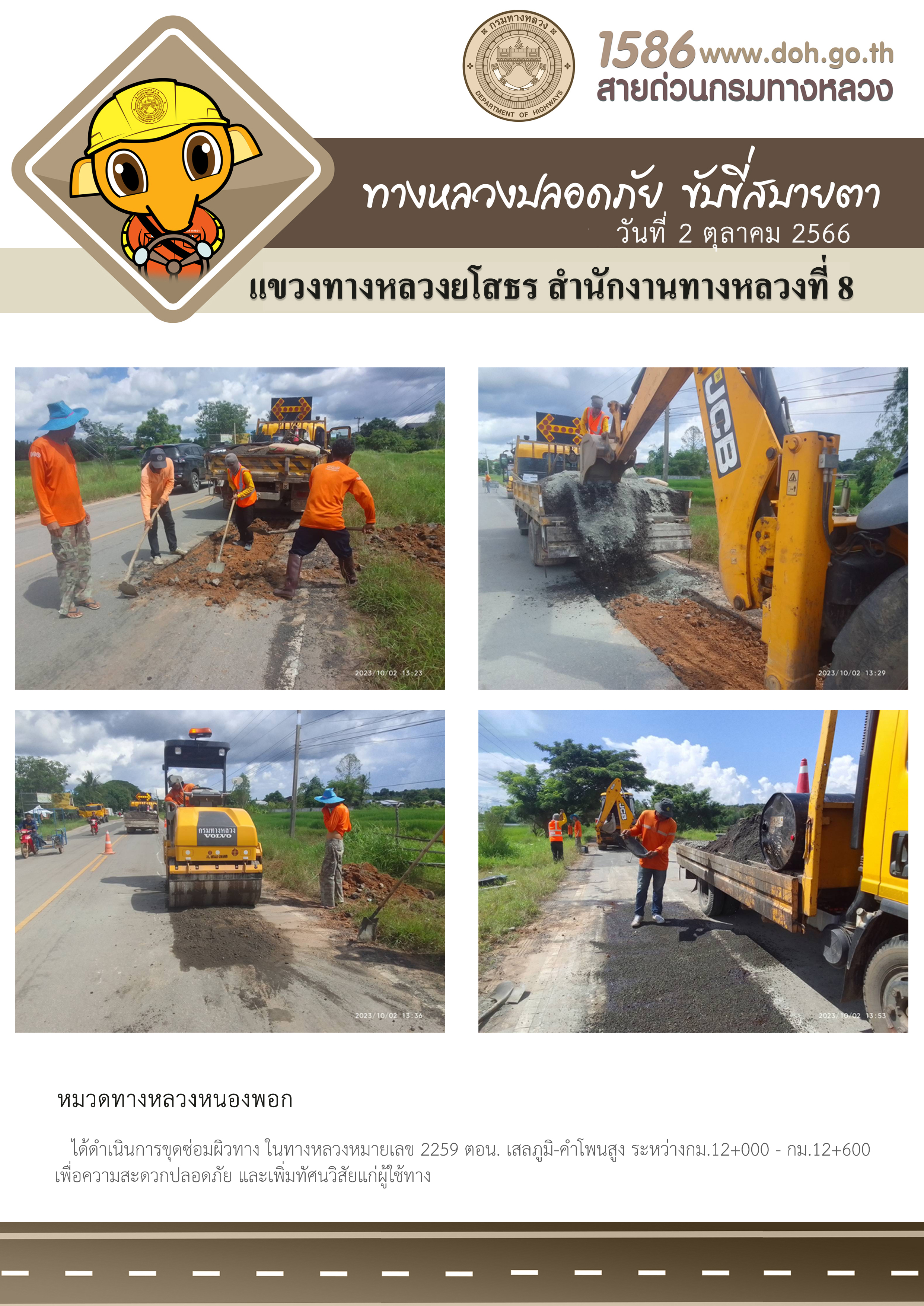 วันที่ 2 ตุลาคม 2566 หมวดทางหลวงหนองพอก ได้ดำเนินการขุดซ่อมผิวทาง ในทางหลวงหมายเลข 2259 ตอน เสลภูมิ-คำโพนสูง ระหว่าง กม.12+000 - กม.12+600 เพื่อความสะดวกปลอดภัย และเพิ่มทัศนวิสัยแก่ผู้ใช้ทาง