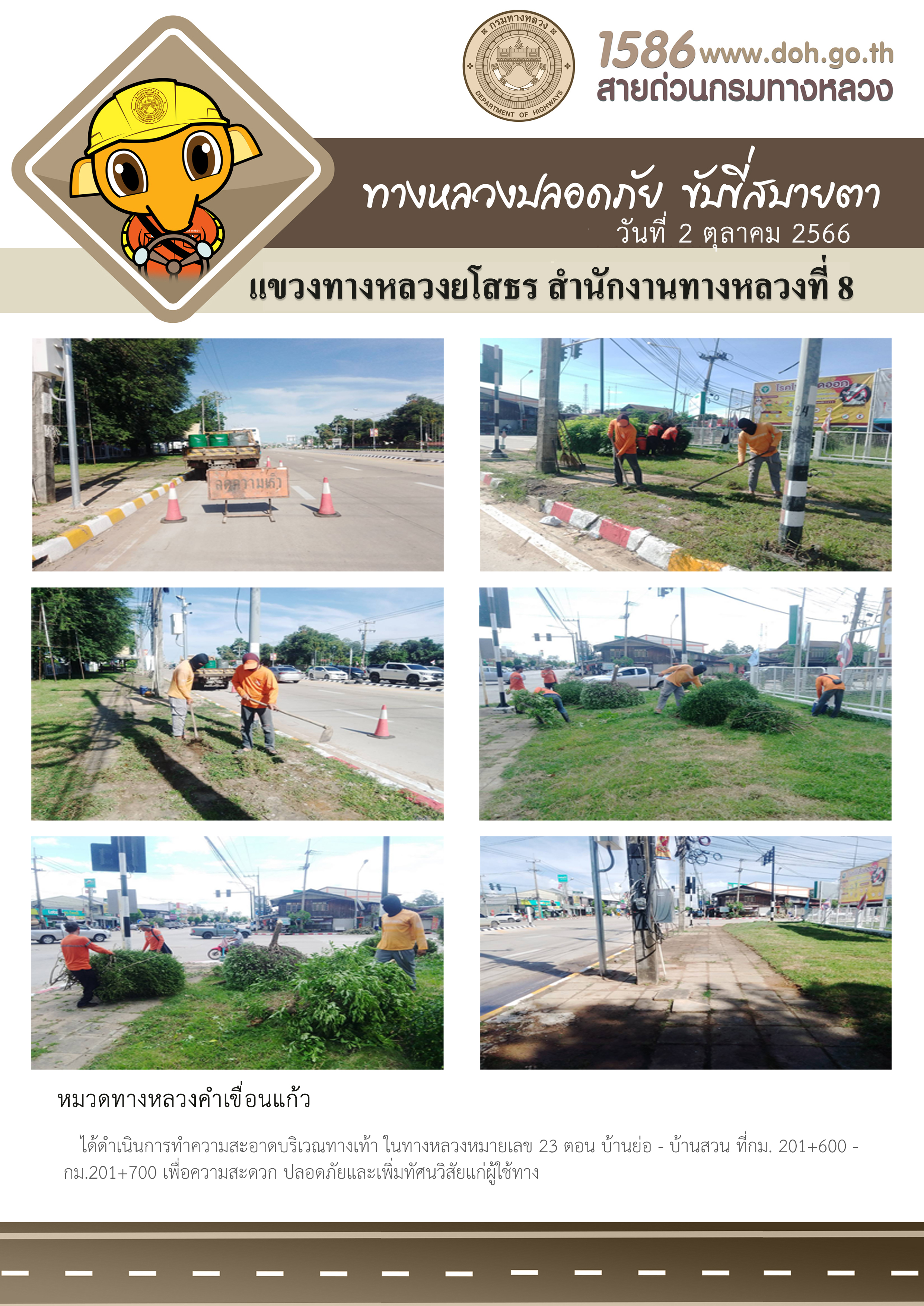 วันที่ 2 ตุลาคม 2566 หมวดทางหลวงคำเขื่อนแก้ว ได้ดำเนินการทำความสะอาดบริเวณทางเท้า ในทางหลวงหมายเลข 23 ตอน บ้านย่อ - บ้านสวน ที่ กม.201+600 - กม.201+700 เพื่อความสะดวก ปลอดภัยและเพิ่มทัศนวิสัยแก่ผู้ใช้ทาง