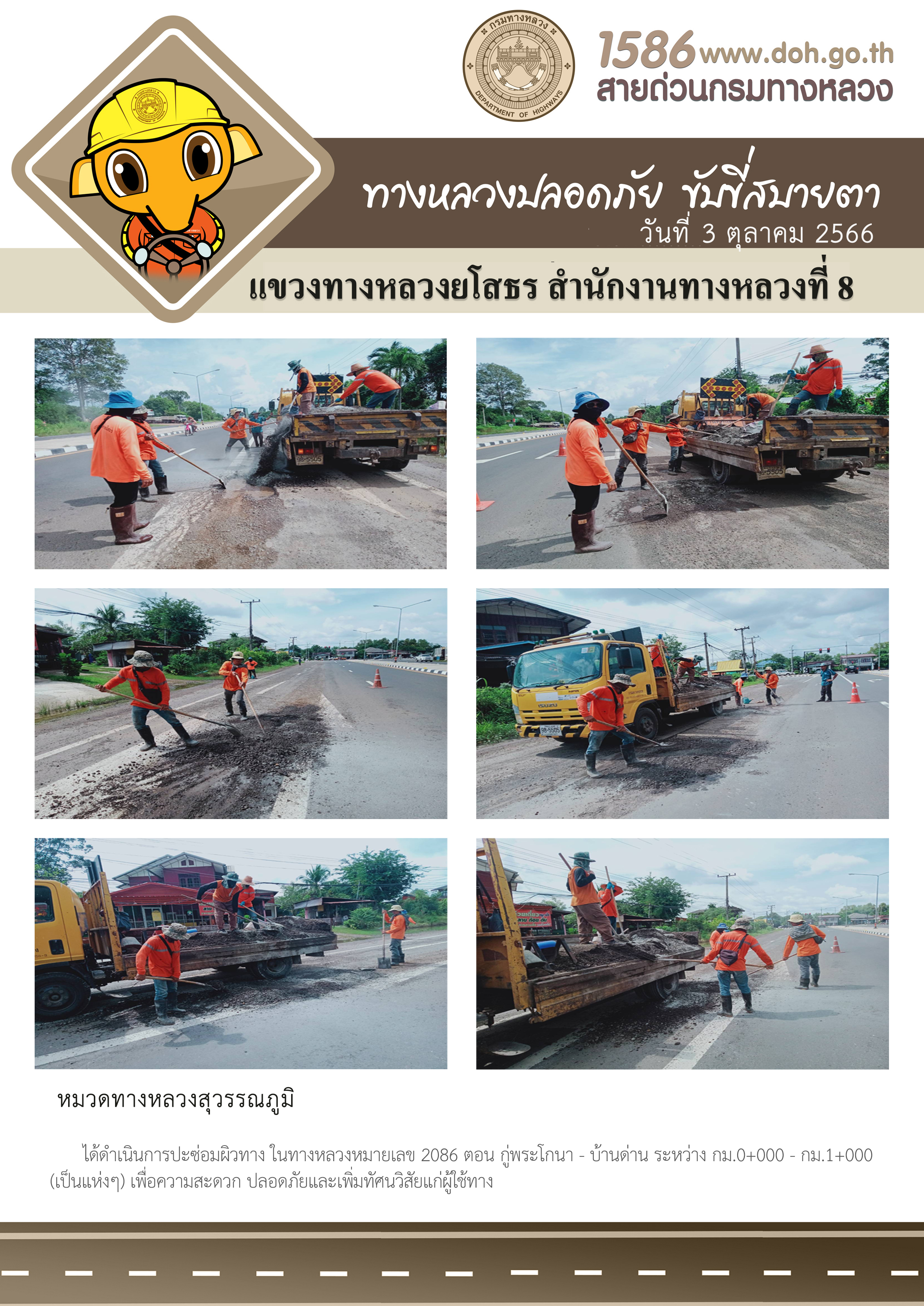 วันที่ 3 ตุลาคม 2566 หมวดทางหลวงสุวรรณภูมิ ได้ดำเนินการปะซ่อมผิวทาง ในทางหลวงหมายเลข 2086 ตอน กู่พระโกนา - บ้านด่าน ระหว่าง กม.0+000 - กม.1+000 (เป็นแห่งๆ) เพื่อความสะดวก ปลอดภัยและเพิ่มทัศนวิสัยแก่ผู้ใช้ทาง
